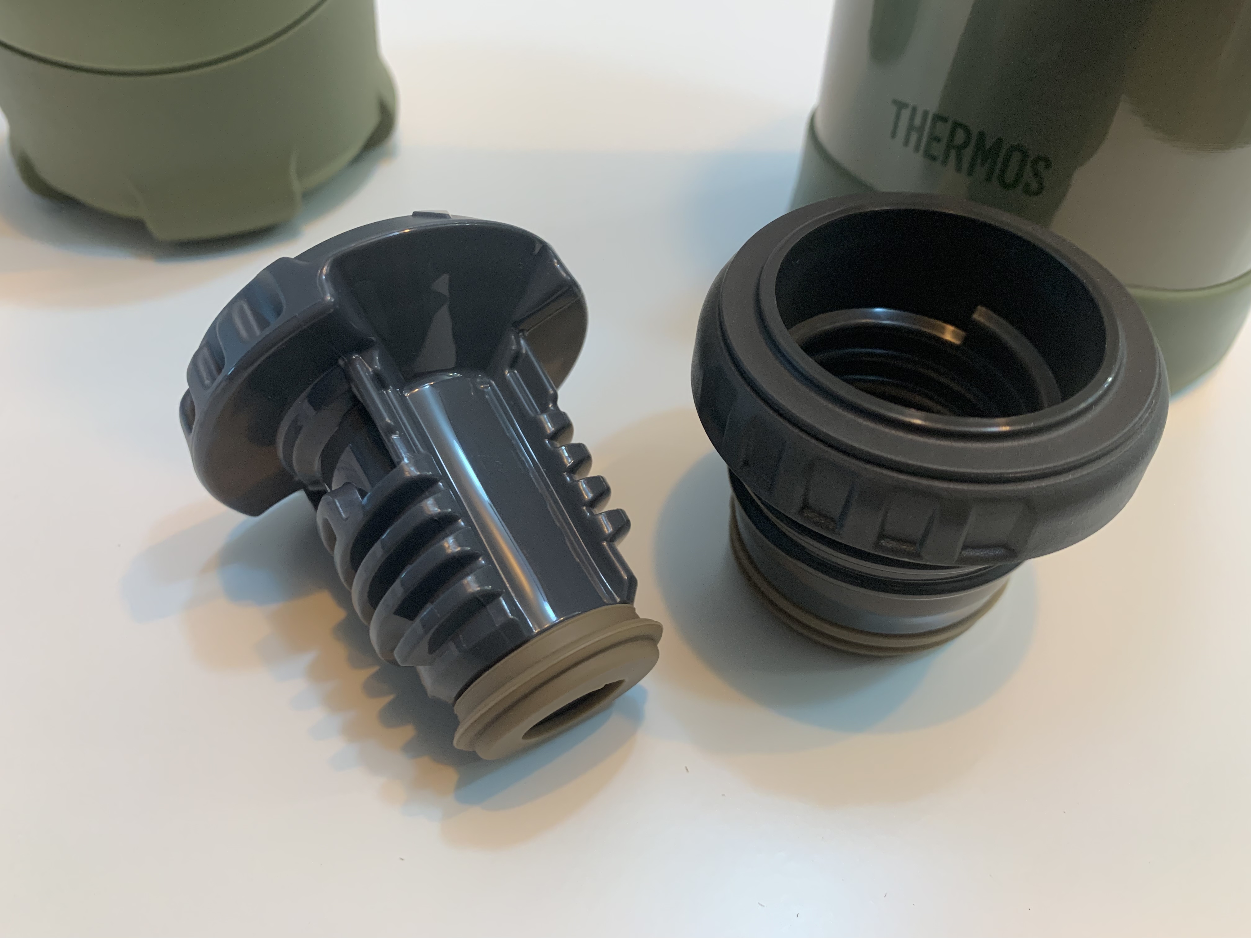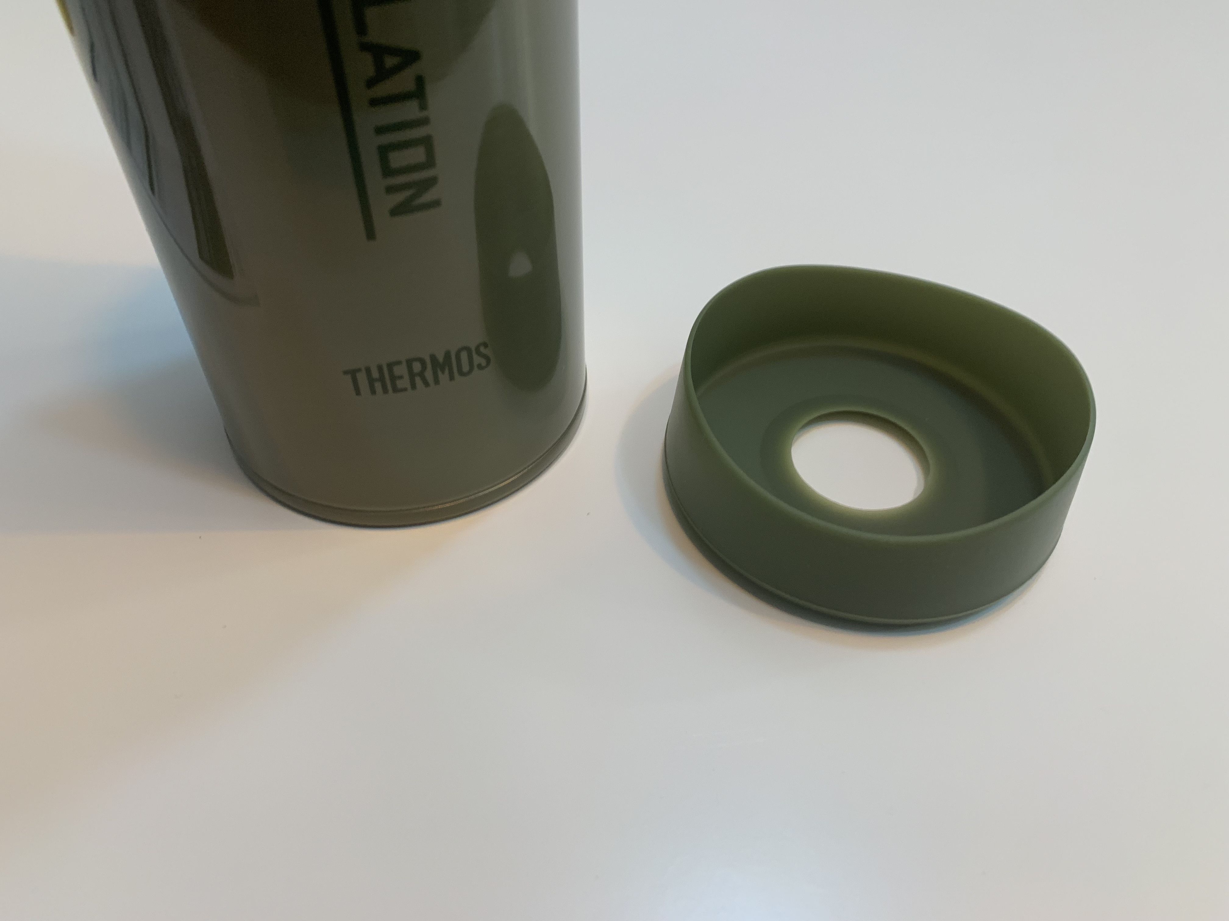 만약 별도의 써모스 전용 파우치를 사용하지 않는다면 보온병을 이 상태로 바닥에 내려놓게 되는데 정말 제가 가진 보온병들 하나같이 아랫부분에 스크래치가 생겼습니다. 이러한 것을 방지하기 위해 사진과 같이 고무 내지는 실리콘 소재로 된 바닥 커버가 끼워져 있습니다. 진짜 아이디어가 좋다고 생각했어요. 저 역시 물건을 좀 아껴서 오랫동안 쓰는 스타일이라 제품에 생기는 사소한 스크래치에 민감하거든요. 그리고 이 커버는 만약 파우치를 사용하신다면 제거해야 합니다. 고무의 마찰력 때문에 파우치에 제대로 넣기가 상당히 어렵습니다. 파우치가 있으면 굳이 커버가 불필요하기도 하고 써모스에서 제공하는 제원상으로 30g을 줄일 수 있습니다.
