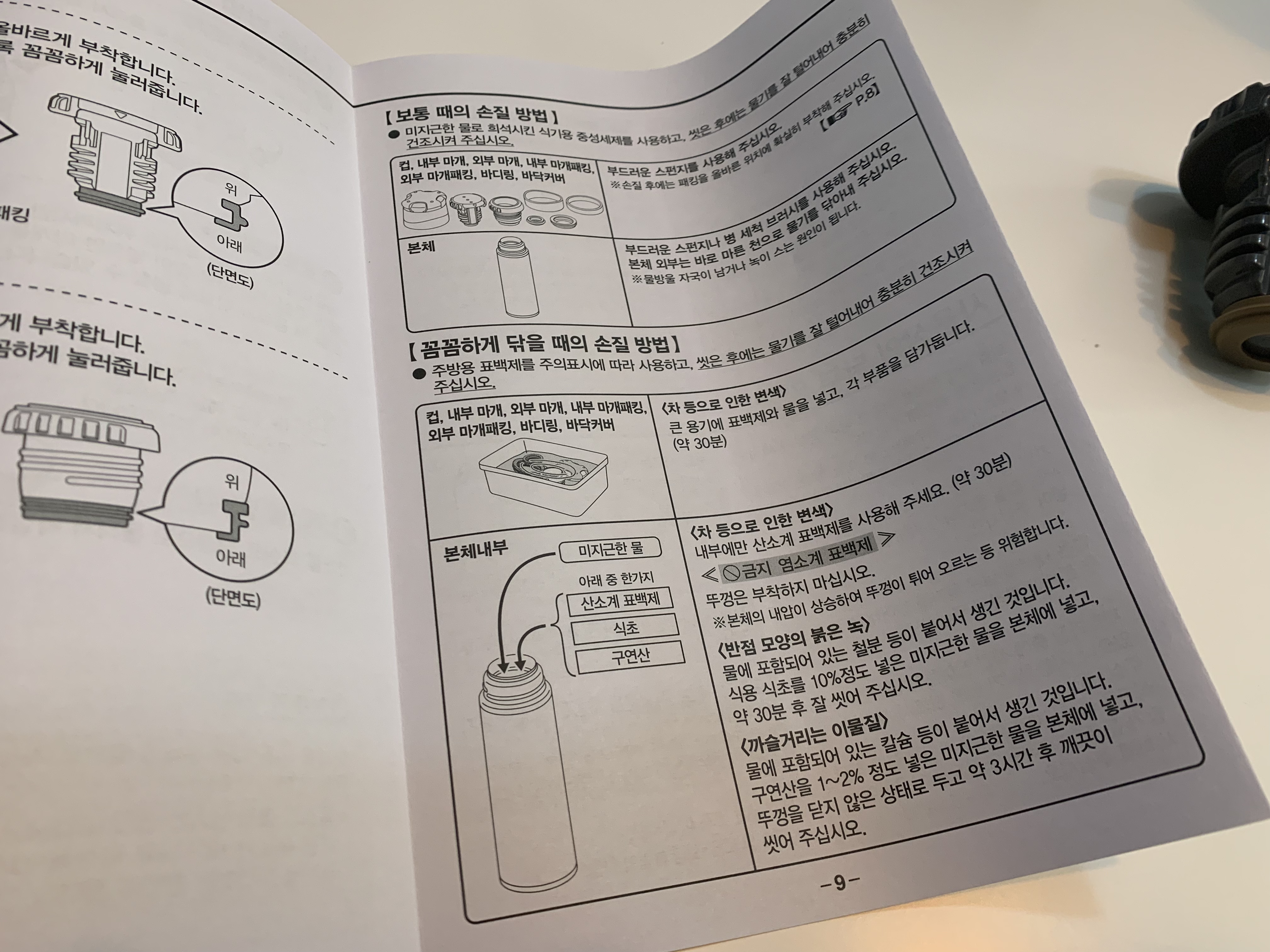 특히 여름에 자주 발생하는 일인데, 물만 담아서 쓰더라도 가끔 보온병에서 불쾌한 냄새가 나는 경우가 있습니다. 항상 그럴 때마다 락스를 물로 희석해서 담가놓고 소독을 해서 냄새를 제거했는데 그간 잘못한 게 있었습니다. 고무 패킹이나 뚜껑, 그리고 마개와 같은 부속들은 염소계 표백제, 즉 락스를 사용하는 것이 가능한데 본체는 산소계 표백제를 사용해야 한다고 합니다. 과탄산소다 같은 걸 말한다고 합니다. 등산복이나 장비도 그렇지만 이런 보온병도 솔직히 저렴한 가격은 아니잖아요. 오랫동안 별 탈 없이 쓰려면 꼭 한 번씩 매뉴얼을 읽어 보는 게 필요할 것 같습니다.