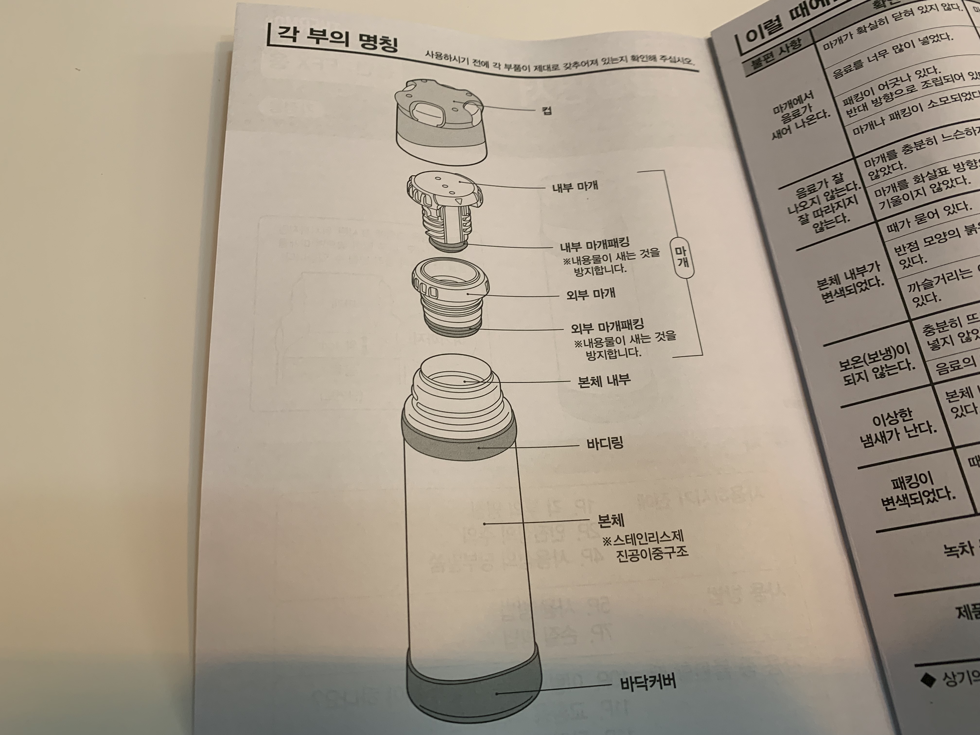 물건을 받고 가장 놀라웠던 점은 들었을 때 정말 가볍다는 점입니다. 박스째로 들어봐도 가볍다는 걸 느낄 수 있었는데 이게 보온병이 맞나 싶을 정도로 그간 가지고 있던 보온병들은 대체 왜 그렇게 무거웠던 것인지 의문이 가더라고요. 포장 겉면에는 간단한 설명이 있고 보온병에 있는 고무패킹이나 뚜껑을 포함한 교환용 부품을 별도로 구매할 수 있다는 안내도 되어있습니다.