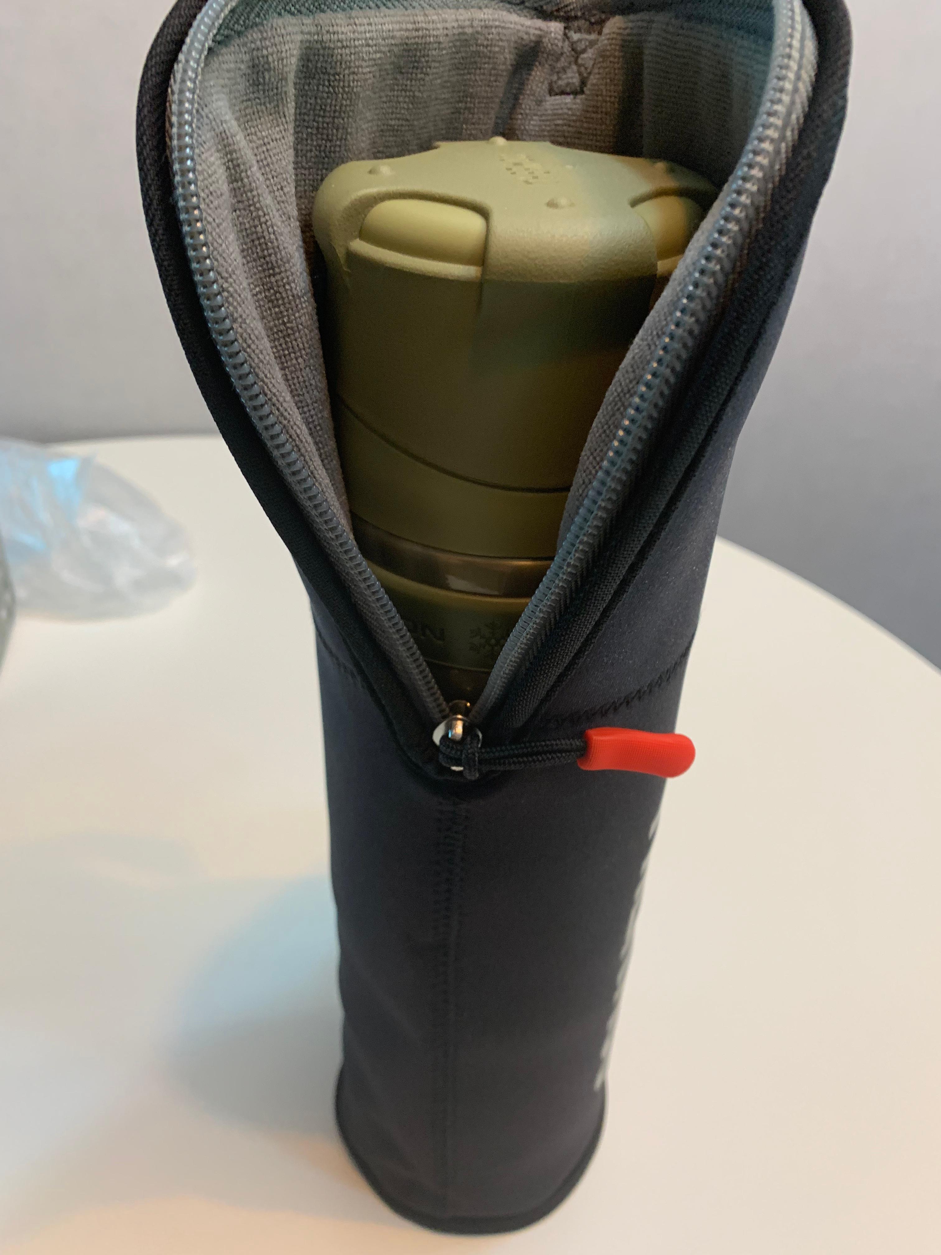 별도로 판매하는 파우치에 넣은 모습입니다. 두툼한 편이라서 충격을 방지하고 보온병 외부에 생길 수 있는 흠집을 방지할 수 있습니다. 넣고 빼기에도 쉬운 구조이고 고리도 있어 혹시나 사이드포켓에서 빠지거나 떨어지지 않게 배낭에 이중으로 결속하기에도 좋을 것 같아요.