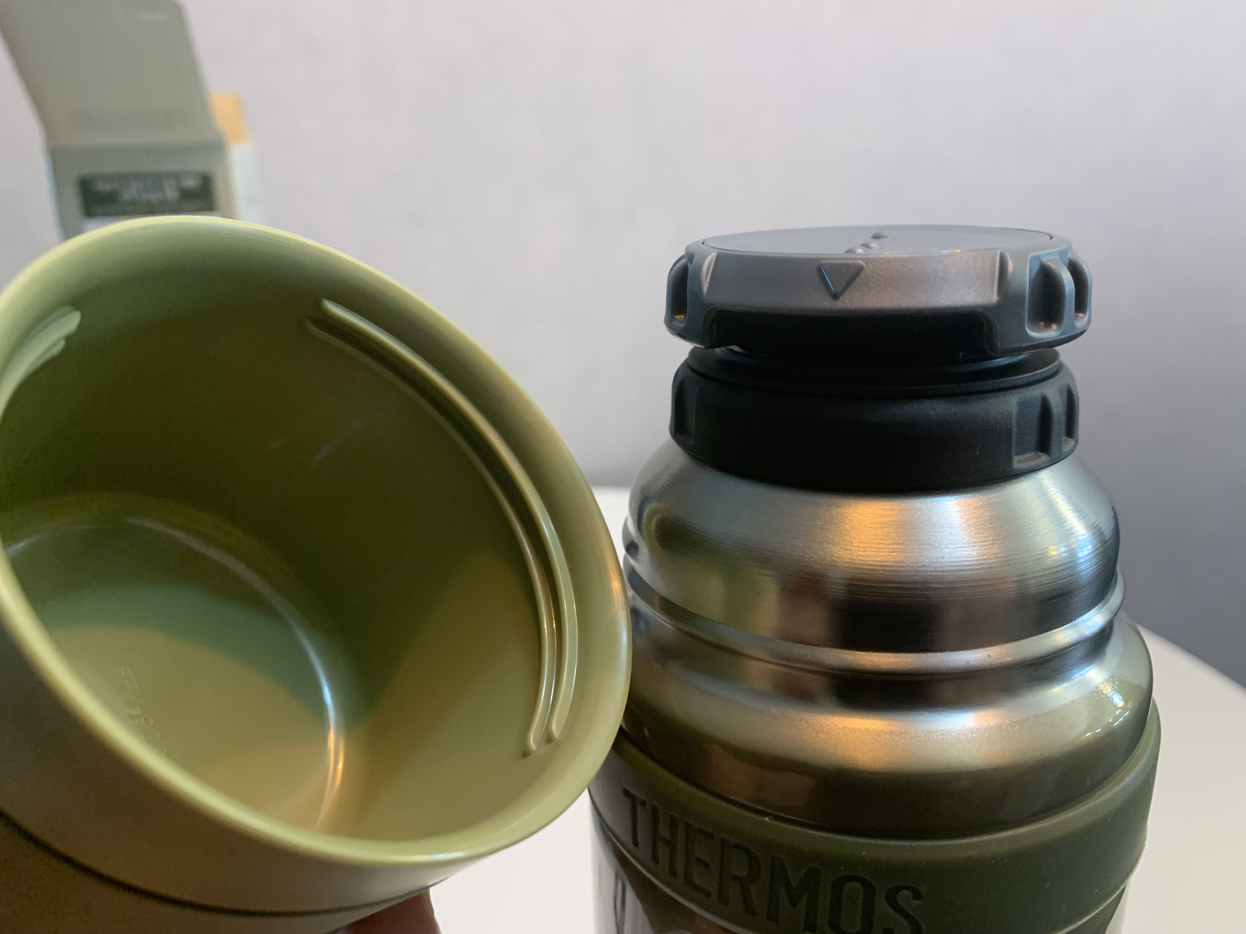 써모스 보온병 상부의 모습입니다. 병목 바로 밑 부분에 실리콘과 비슷한 소재로 링이 끼워져 있어 장갑을 착용한 상태에서도 미끄러짐 없이 쉽게 잡을 수 있습니다. 물론 탈거도 가능해서 세척 시에는 빼놓고 쓸 수 있습니다.
