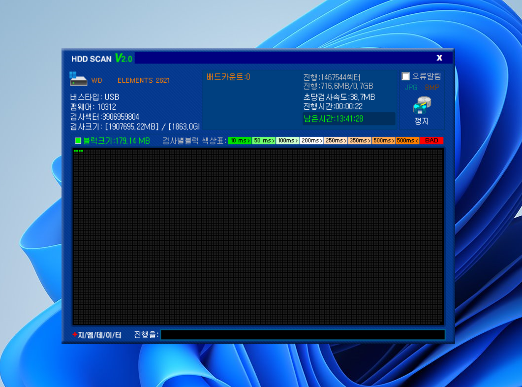 이러한 순서로 진행이 됩니다. 참고로 검사 결과 이러한 녹색 점들이 화면에 가득 채워지면 문제없는 하드고 중간에 빨간 표시가 나타난다면 불량 섹터로 보시면 됩니다. 저는 솔직히 말씀드려서 검사를 끝까지 진행하지 못하고 도중에 중단했습니다.