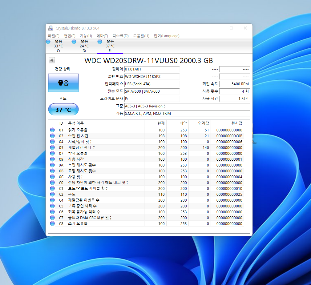WD Elements Portable 2TB의 상태입니다. 파란색이 가장 좋은 상태고 만약 노란색이 표시된다면 주의를 요망한다는 의미로 보면 됩니다. 즉 언제든 불량 섹터가 나올 확률이 높다는 의미라고 합니다. 그뿐만 아니라 저장 장치의 사용 시간, 횟수 등의 정보도 볼 수 있어 주기적으로 체크한다면 사전에 하드가 손상되어 데이터가 소실되기 전에 미리 대응도 할 수 있습니다.