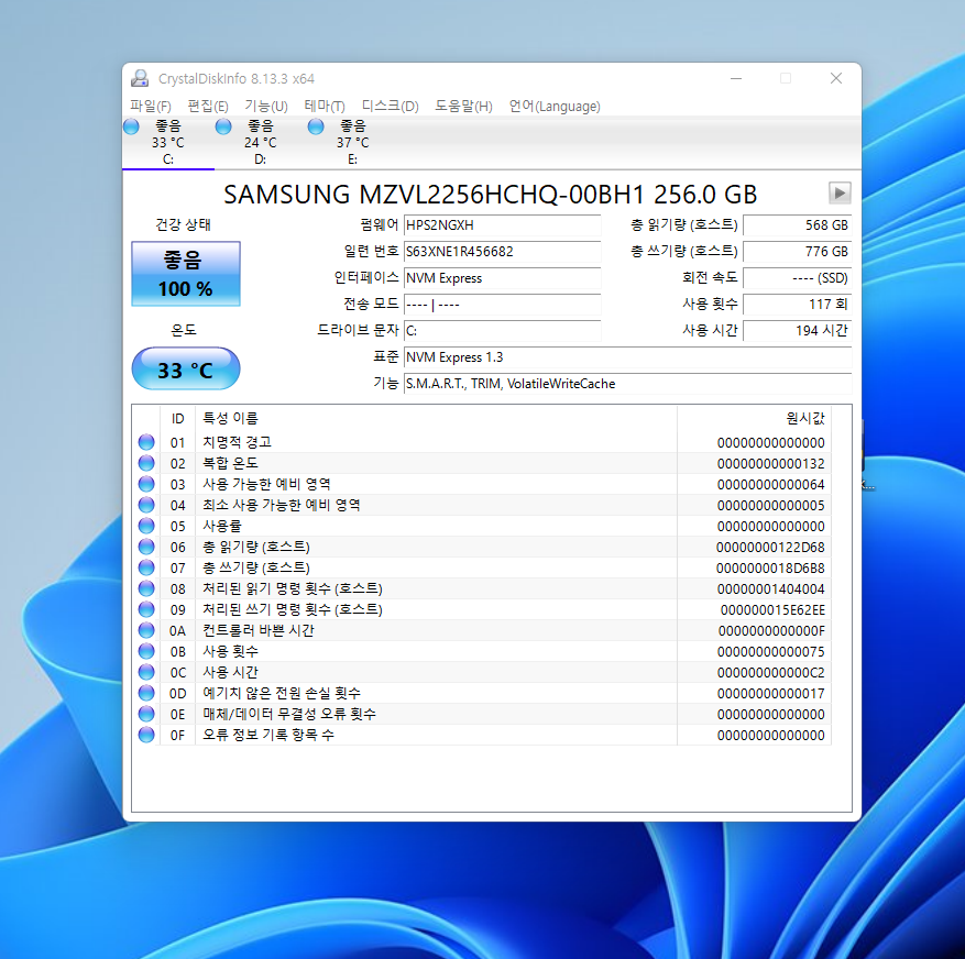 참고로 제 노트북에 설치된 두 개의 256GB SSD의 상태입니다. 사용한지 두 달 정도 지났으니 아직도 상태가 좋은 것은 너무도 당연하겠죠?
