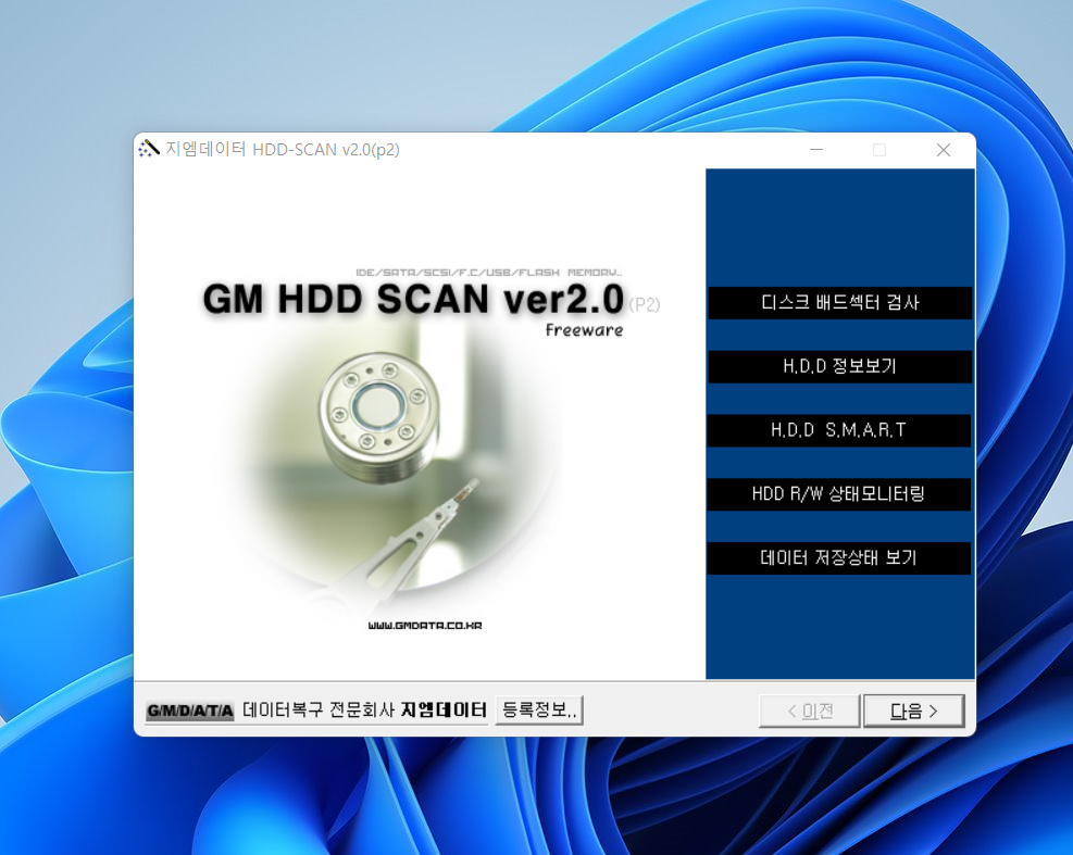 다음으로 불량 섹터 검사입니다. 역시 구글에서 'GM HDD 스캔'으로 검색하면 위와 같은 소프트웨어를 다운받으실 수 있습니다. 해당 링크를 제공하는 페이지들이 다수 검색될 거예요. 다음으로 넘긴 후 가장 첫 번째에 있는 '전체/부분/ 디스크 배드 섹터 검사'를 선택하신 후에 다음으로 진행합니다.