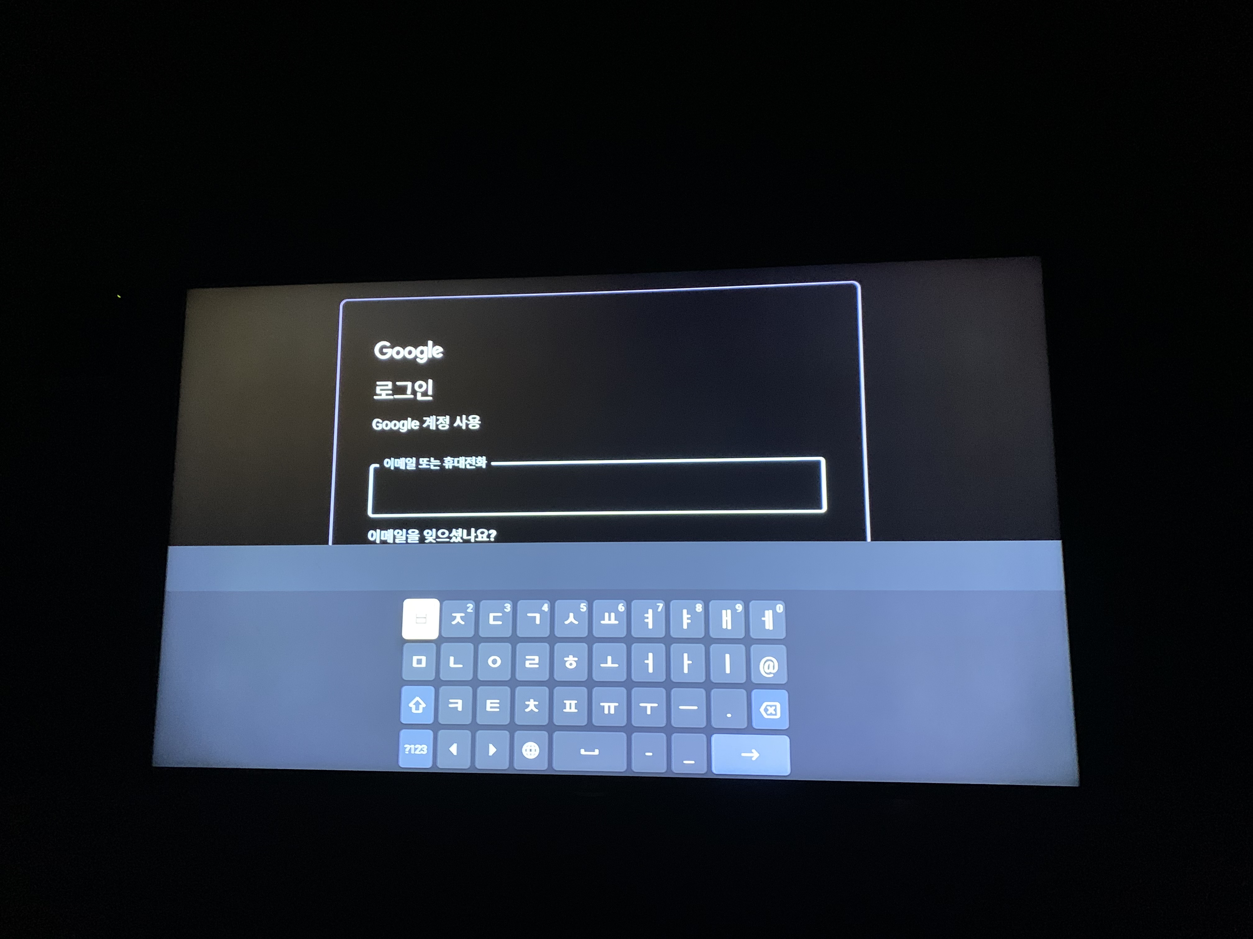 드디어 '연결 중'이라는 문구가 사라지고 구글 아이디를 입력하라는 화면이 나옵니다. 크롬캐스트에서 제공하는 리모컨의 방향 키를 이용하여 차분히 입력하면 됩니다.