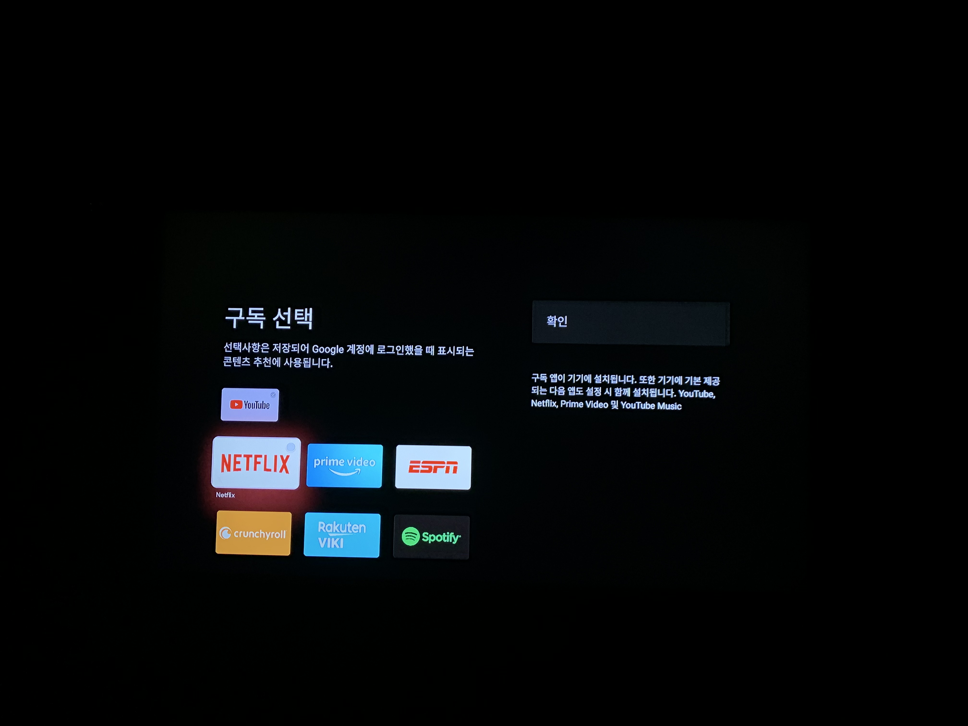 드디어 뭔가 끝이 보이는 느낌이에요. 유튜브는 당연히 구글의 플랫폼이라 기본적으로 선택이 되어있고요 그 외에 넷플릭스를 비롯한 기타 플랫폼을 선택하면 바로 설치 절차에 들어갑니다. 대략 2~3분 정도의 설치 시간이 소요됩니다.
