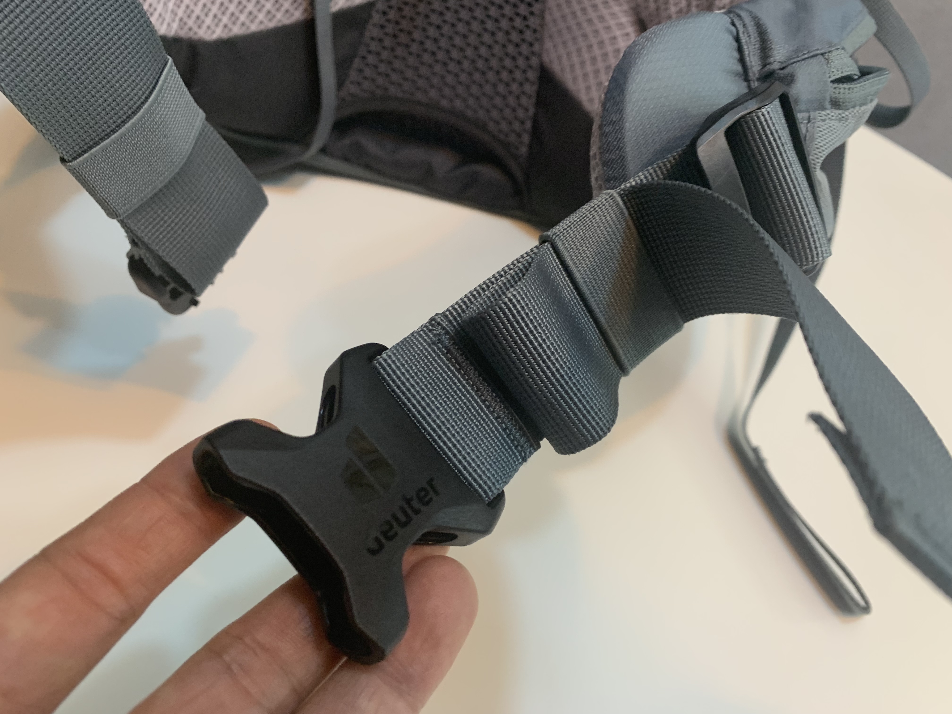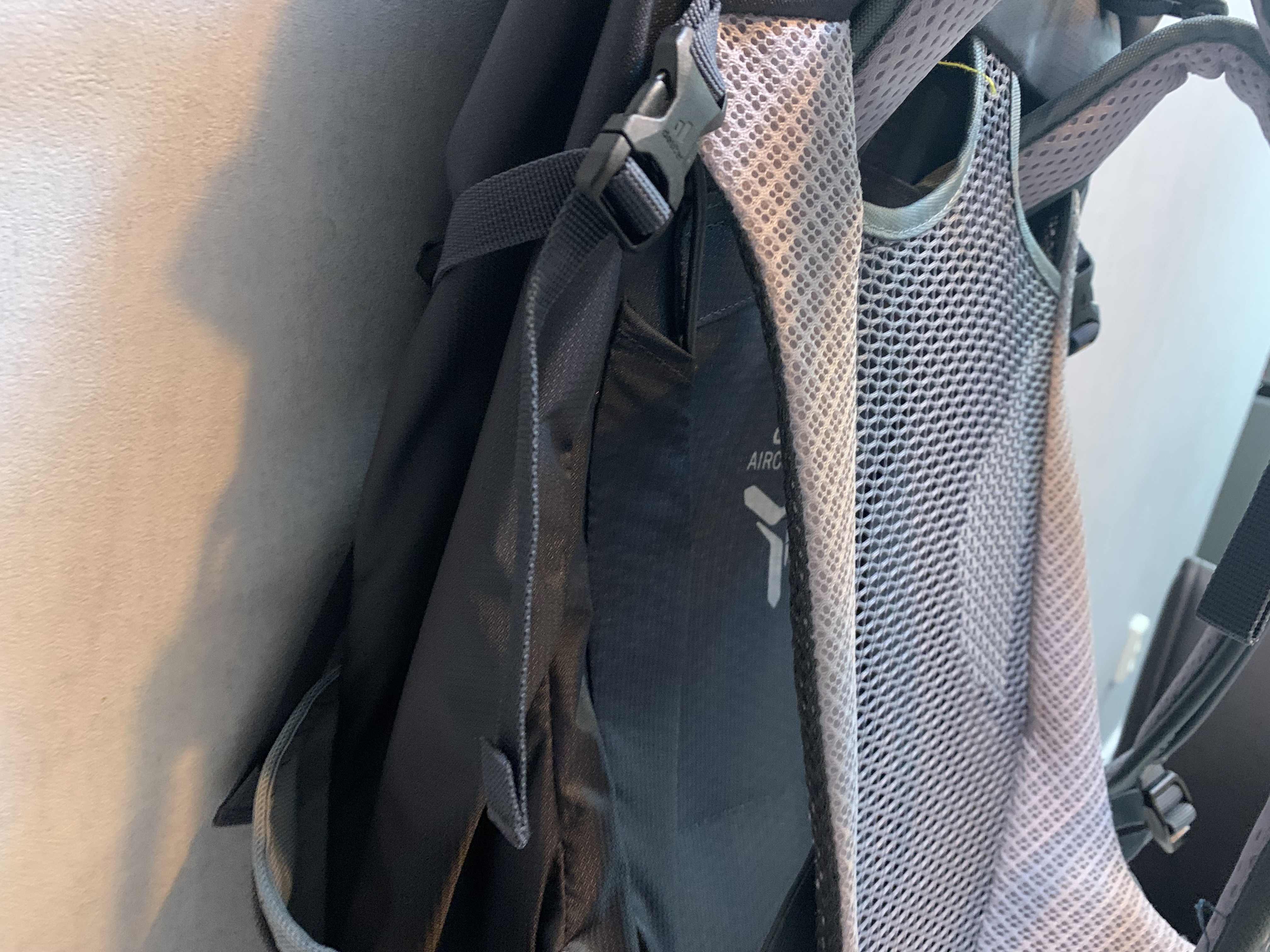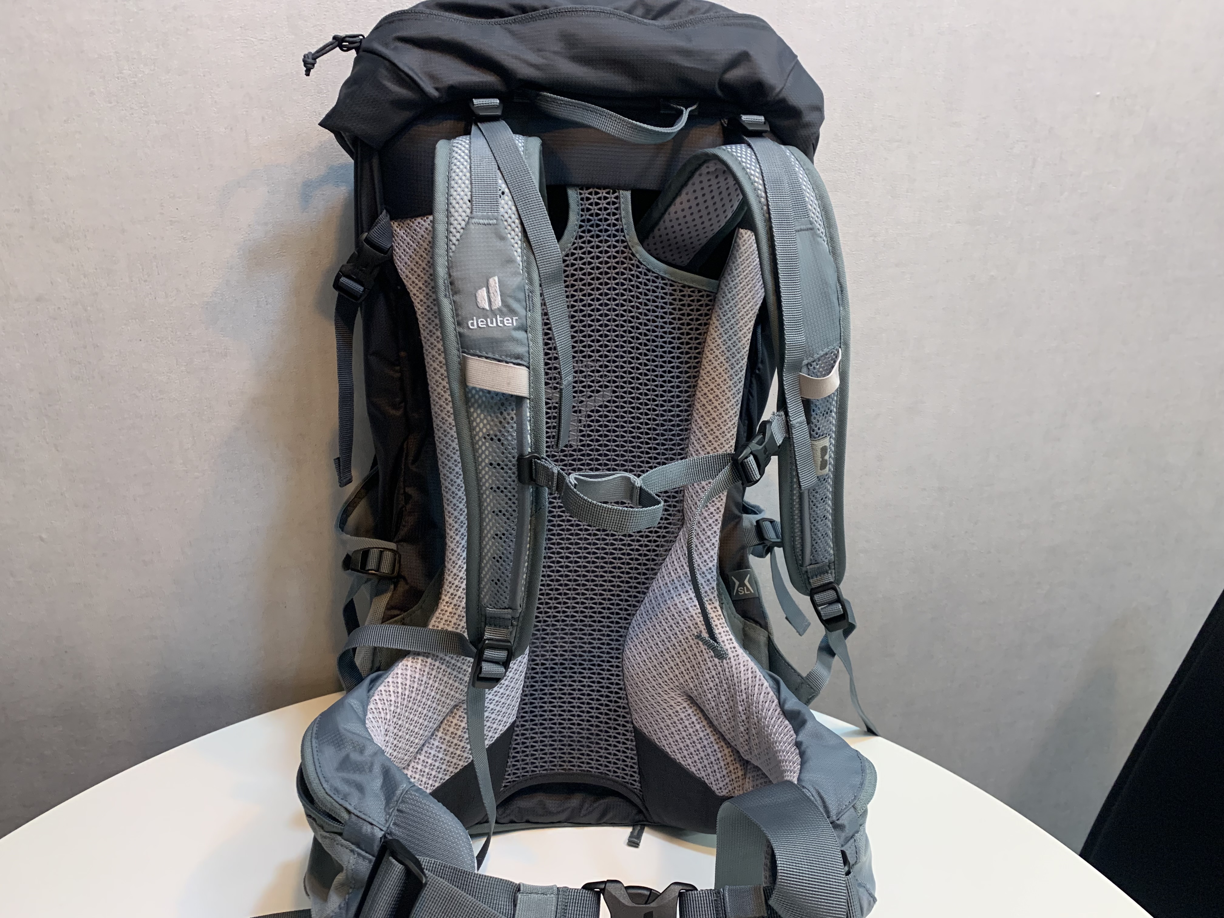 푸트라 프로 40과 마찬가지로 좌측 어깨끈에는 선글라스를 걸 수 있는 밴드가 있습니다. 3대 브랜드의 배낭들 중에서 경량으로 나온 소형 배낭이 아닌 이상 우측 사진과 같이 대부분 공중부양 기능이 있습니다. 이걸 도이터에서는 AirComfort라고 부르는데 확실히 도이터의 배낭들이 등판과 배낭 사이의 공간이 더 넓은 느낌을 받습니다. 그간 배낭 착용을 하며 느낀 것을 바탕으로 장단점 몇 가지를 말씀드리자면 일단 공간이 넓기 때문에 여름에는 더 시원하고 땀이 잘 마르는 것이 확실하지만 반대로 겨울에는 등이 좀 서늘하다는 느낌이 있습니다. 큰 문제는 아니지만 혹시나 추위를 많이 느끼시는 분은 이로 인한 불편함을 느끼실지도 모르겠습니다.