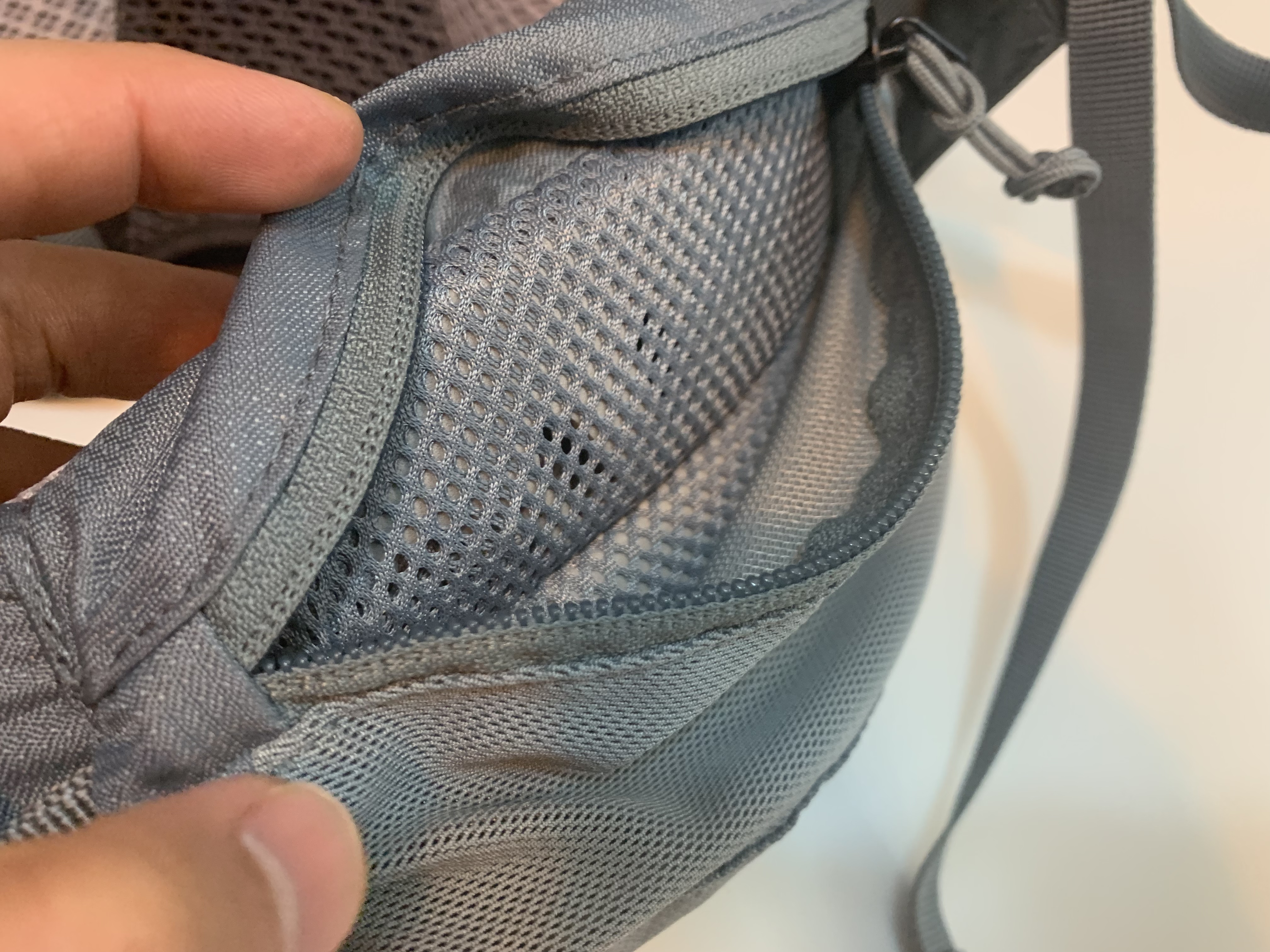 힙벨트에 있는 포켓 크기는 아이폰X 정도는 충분히 들어간다고 합니다. 자세히 보시면 힙벨트 자체도 어깨끈과 마찬가지로 통기성이 잘 확보된 모습이고요. 포켓의 겉면 역시 탄력성이 있는 메쉬형 소재로 되어있습니다. 물건을 좀 더 넣기에도 좋고 미약하지만 바람이 더 잘 통하는 데에도 도움이 됩니다.