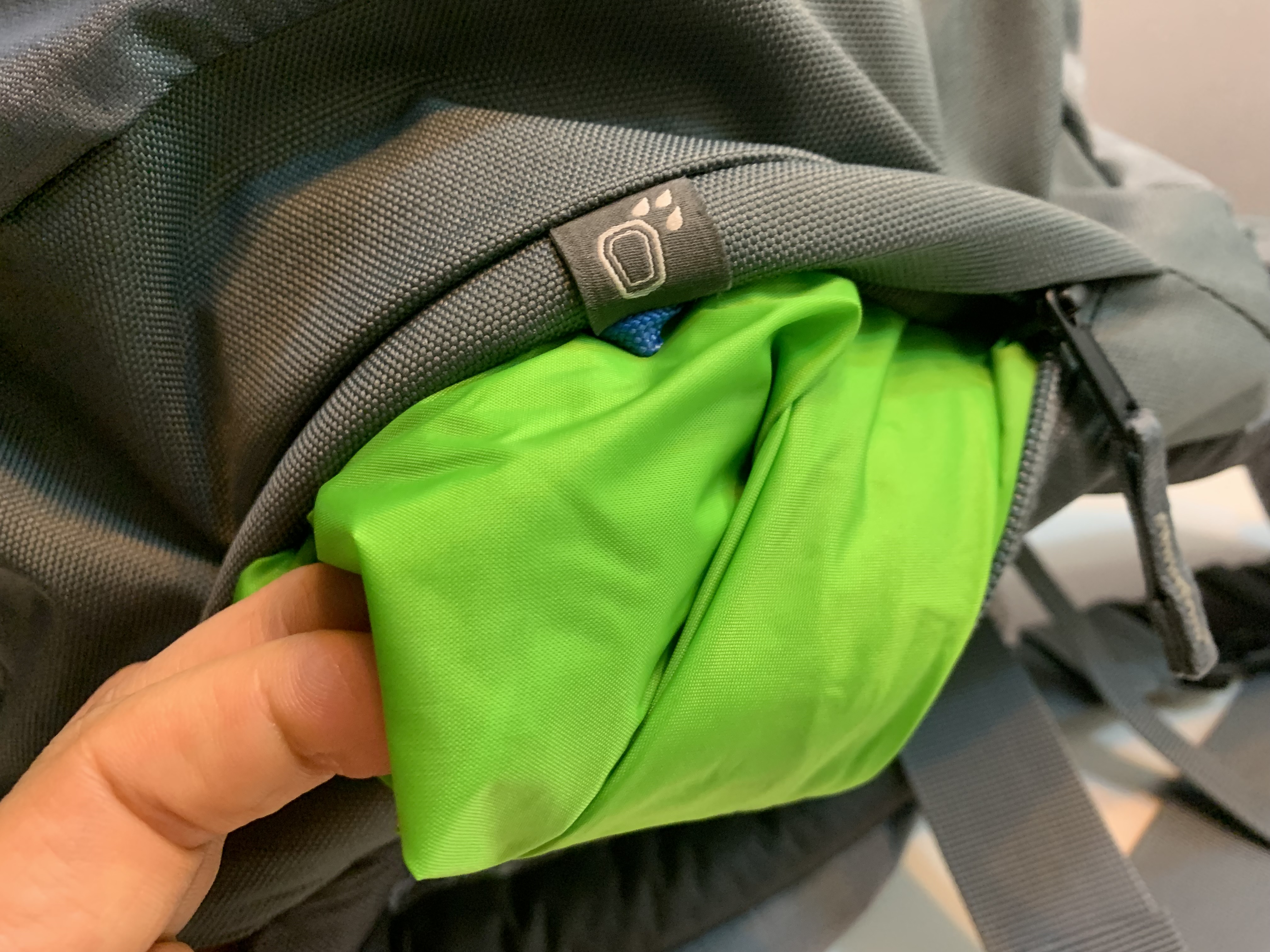 배낭 하부에는 레인커버가 있습니다. 흐리거나 비가 올 것 같은 날은 산행을 하지 않지만 산 위에서는 무슨 일이 발생할지 모르니 기왕이면 이렇게 레인커버를 제공하는 제품을 선호하게 됩니다. 비록 무게가 조금 더 나가더라도요. 또한 레인커버 파우치 자체가 손이 잘 가지 않는 가장 아랫부분에 있기 때문에 수납에 꼭 필요한 공간들에 방해되지 않고 보관할 수 있다는 것이 정말 좋았습니다.