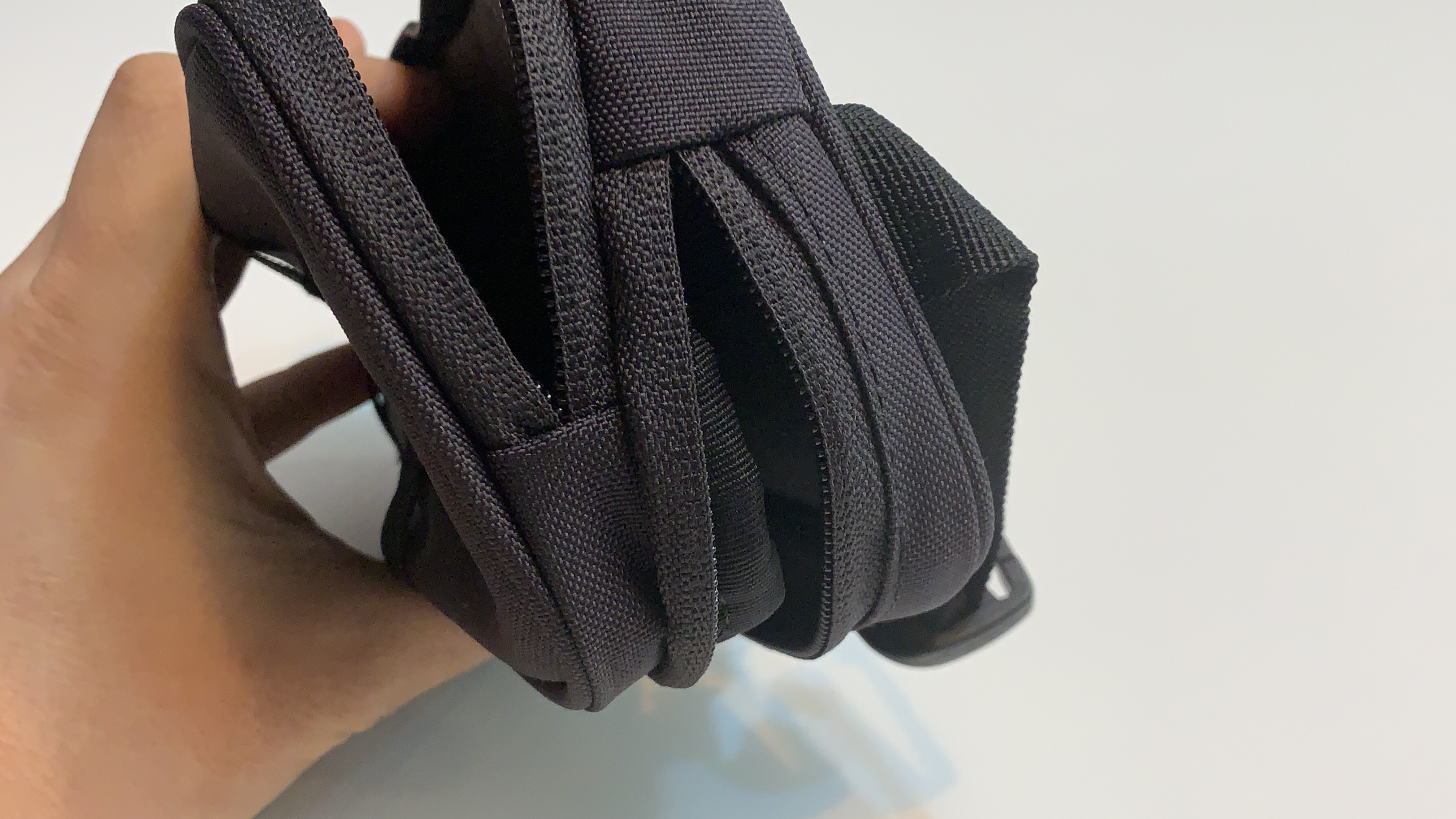 위에서 말씀드린 대로 코듀라 원단이 사용되었습니다. 확실히 겉면의 느낌이 견고하고 튼튼한 느낌이 듭니다. 굳이 이 제품에 코듀라를 쓸 필요는 없다고 생각하실 수도 있겠지만 아무래도 한 번의 산행 동안 정말 수시로 손이 많이 가고 열었다 닫았다를 반복해야 하는 만큼 내구성은 꼭 챙겨야 하는 부분으로 보입니다.