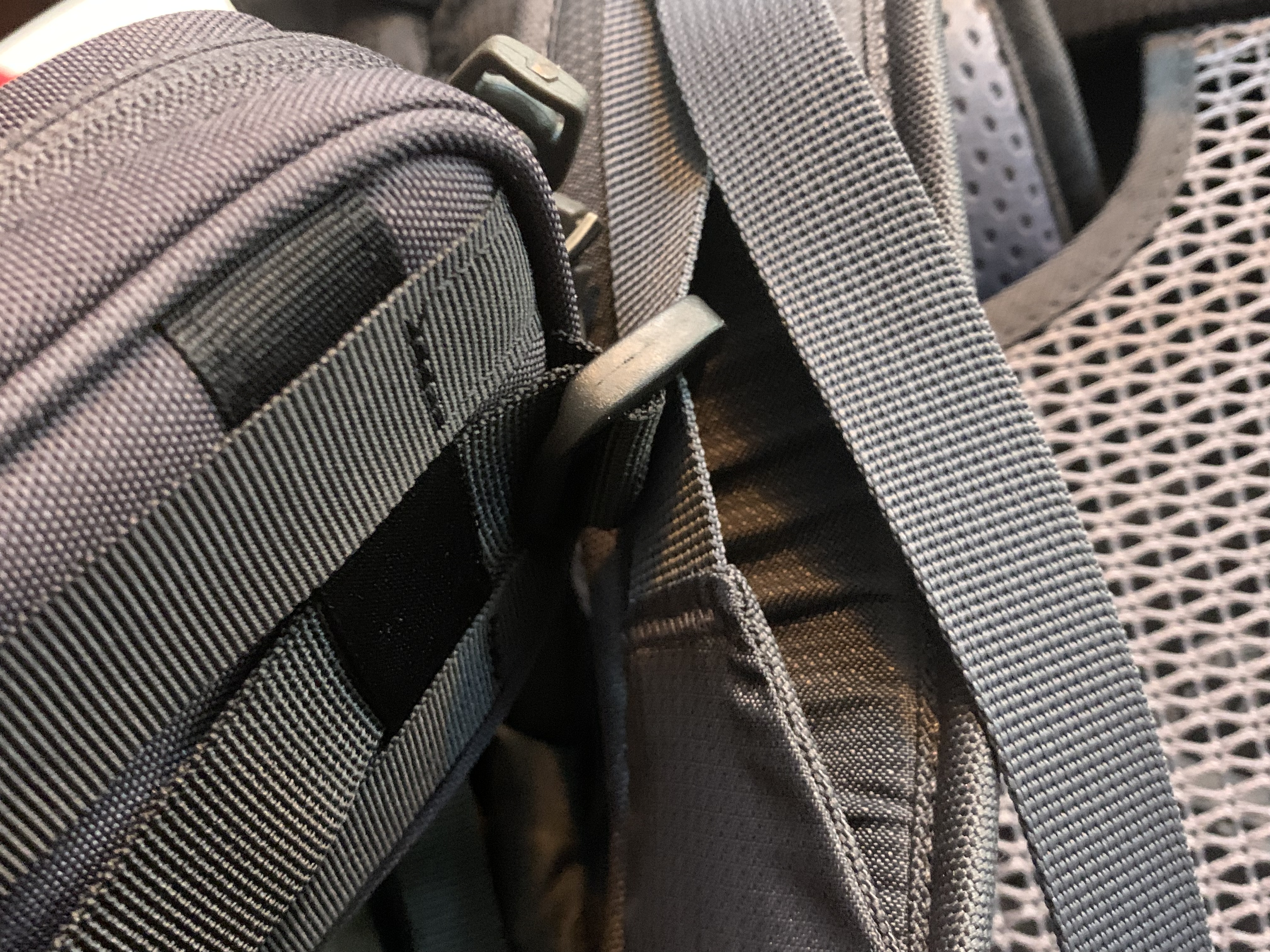 이후 하단에 있는 가로 방향의 고리를 배낭 어깨끈에 꽉 조이게끔 고정시켜주면 설치는 끝납니다. 사진으로 보면 좀 커 보이기는 하는데 막상 필드에서 느낀 바로는 운행 중에 불편하거나 거슬리는 느낌은 전혀 없었습니다.