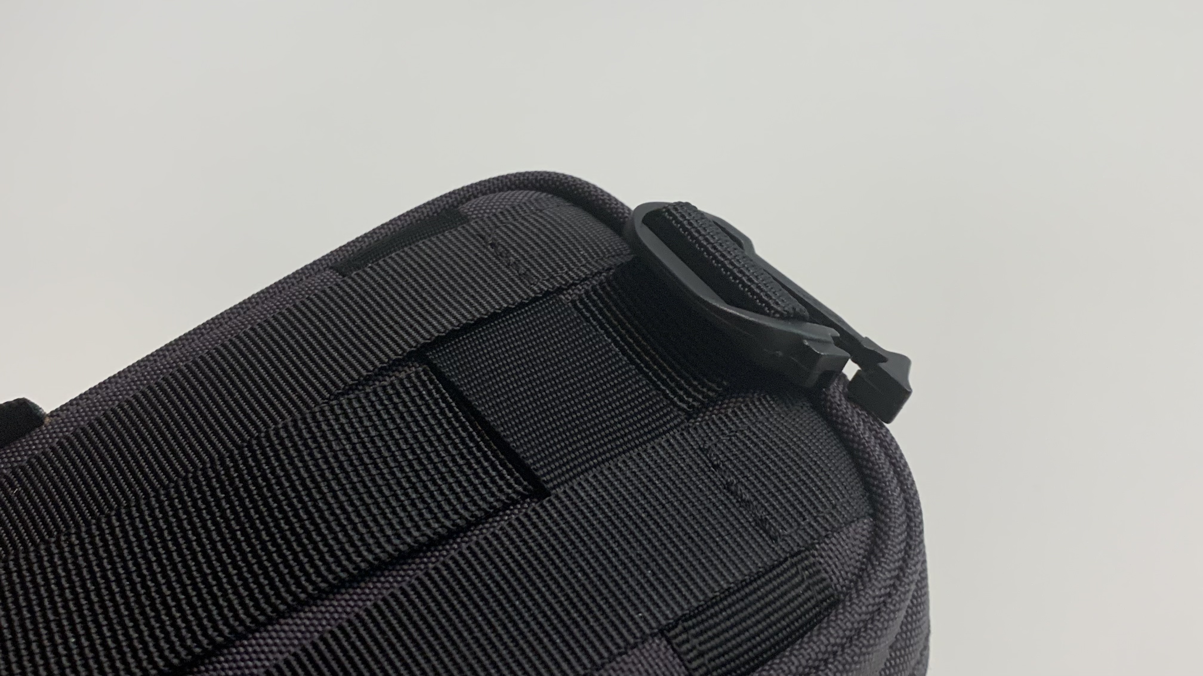 뒷면은 등산 배낭에 걸 수 있는 장치들이 있습니다. 상단에 있는 클립을 배낭의 어깨끈에 연결하고 하단에 있는 가로 방향의 웨빙 스트랩 클립을 어깨끈 뒤로 둘러서 고정하여 캔틴팩이 흔들리지 않도록 고정하면 됩니다. 특히 상단의 클립은 사진과 같이 길이 조절이 가능해서 만약 파우치 자체가 배낭을 멨을 때 너무 위로 올라가있는 상태라면 끈을 조절해서 좀 더 아래로 내려오게 할 수 있습니다.