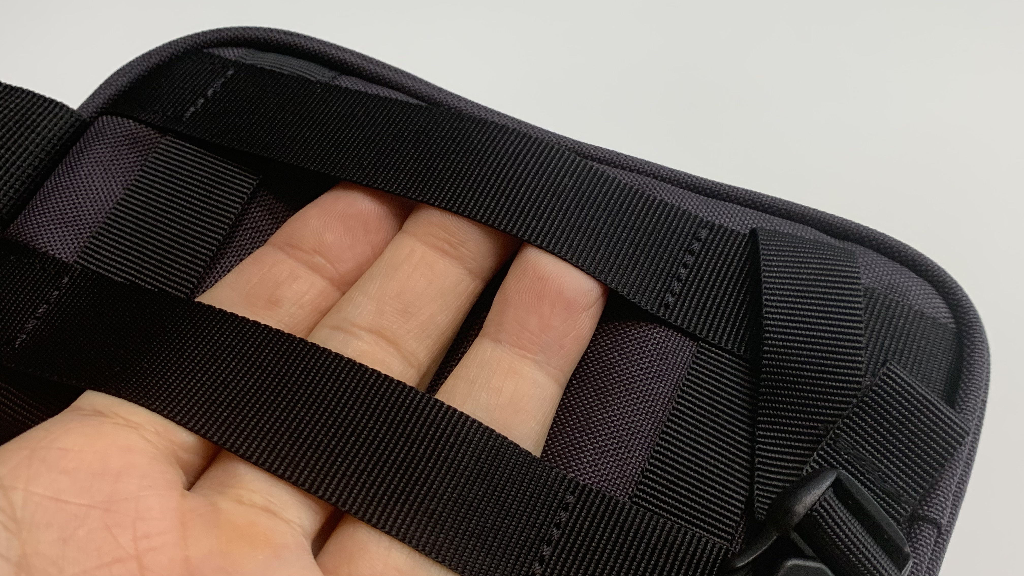 정면의 모습입니다. 웨빙 고리가 두 줄로 있습니다. 카라비너를 연결해서 크게 무겁지 않은 물건도 걸어서 수납할 수 있습니다. 예를 들면 겨울에 사용하는 스마트폰 사진 찍기용 터치펜과 같은 제품이 될 수 있겠네요.