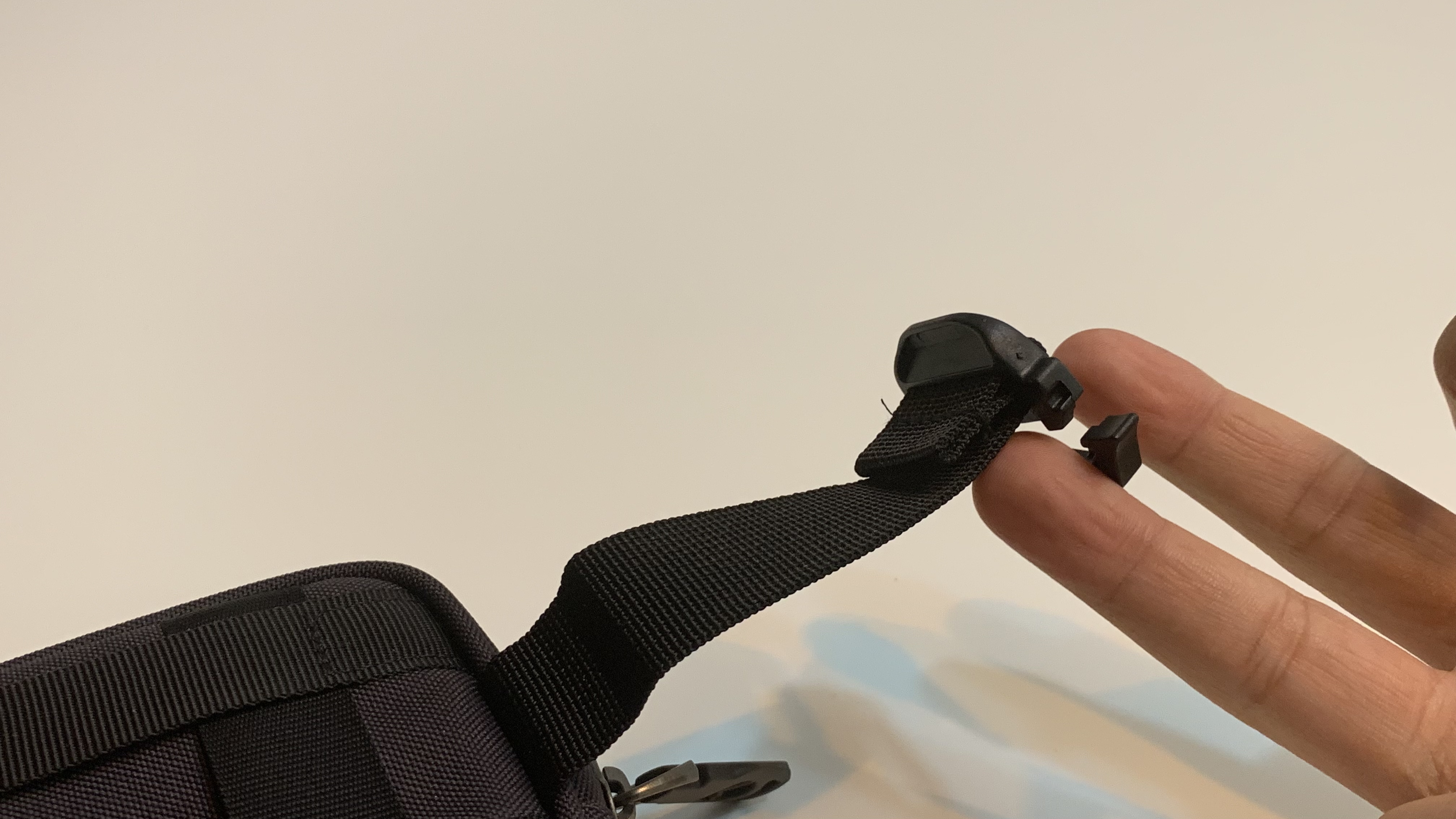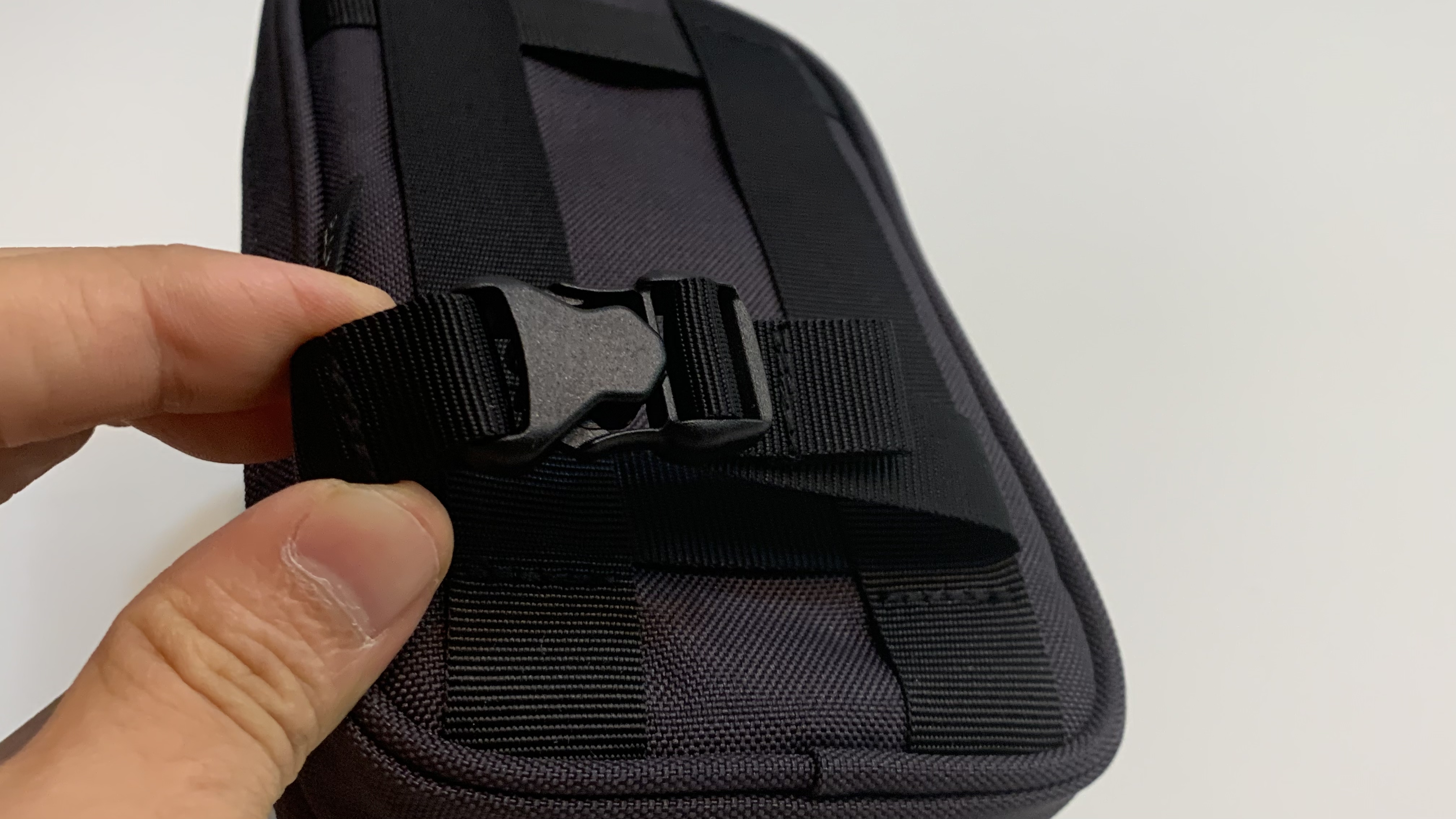이후 하단에 있는 가로 방향의 고리를 배낭 어깨끈에 꽉 조이게끔 고정시켜주면 설치는 끝납니다. 사진으로 보면 좀 커 보이기는 하는데 막상 필드에서 느낀 바로는 운행 중에 불편하거나 거슬리는 느낌은 전혀 없었습니다.