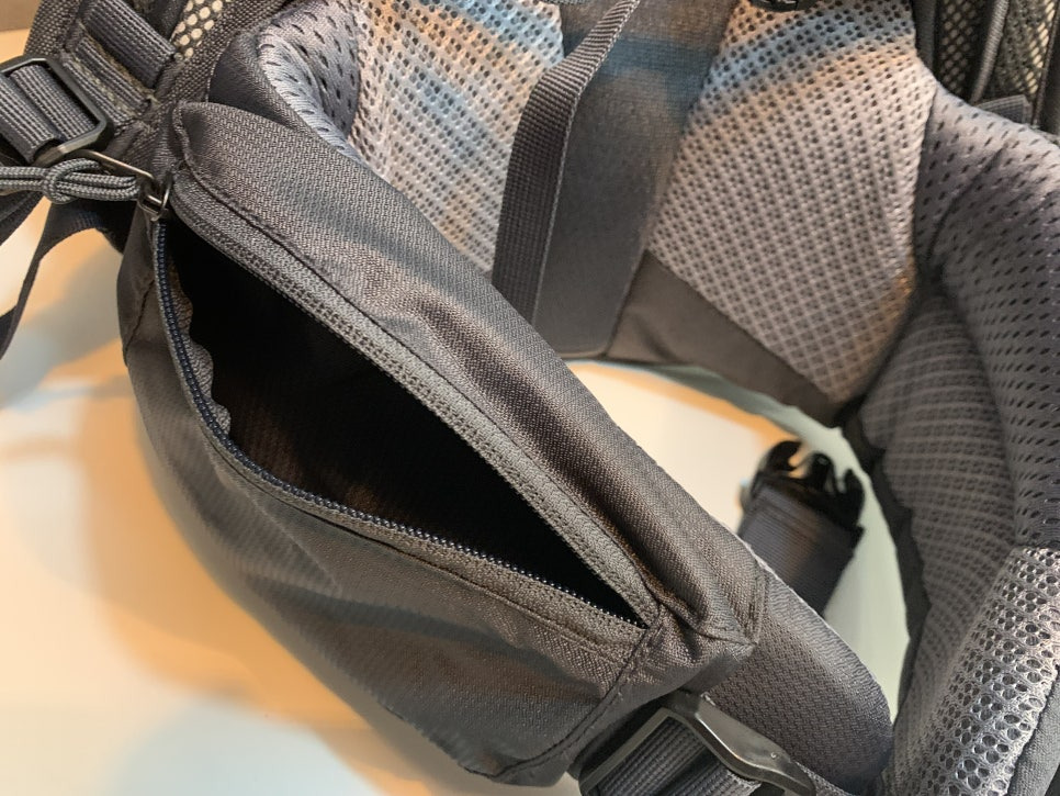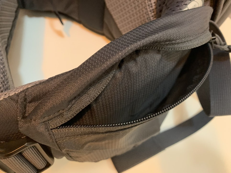 허리 부분의 벨트 포켓입니다. 제가 개인적으로 좀 사이즈가 제법 있는 핸드폰에 심지어 케이스도 두꺼운 제품을 쓰는데 딱 맞게 들어갈 정도로 양쪽이 모두 여유가 있습니다. 대부분 이 공간을 캔디나 포도당, 행동식을 넣어 두고 다는 것으로 알고 있습니다. 배낭을 벗지 않고도 손이 닿을 수 있는 곳이기 때문에 적당한 크기이면서 수시로 꺼내 쓸 수 있는 물건을 수납하면 될 것으로 보입니다.