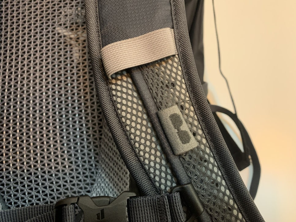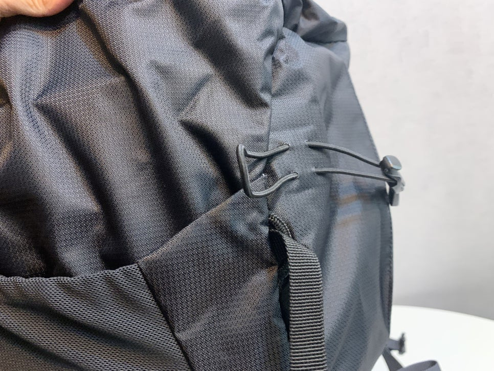 전면에서 살펴볼 특징은 산행 중에 간편하게 수건이나 장갑, 게이터 같은 물품들을 빠르게 수납하고 꺼낼 수 있는 공간인 메쉬형의 스트레칭 포켓이 있습니다. 그리고 왼쪽에는 폴대를 고정할 수 있는 고리가 있습니다. 양옆에 하나씩 거는 방식이 아니라 한쪽에 몰아서 두 개의 폴을 고정하는 방식입니다. 물론 폴딩형의 폴대는 별도의 파우치에 넣어서 사이드포켓에 넣어야 합니다.