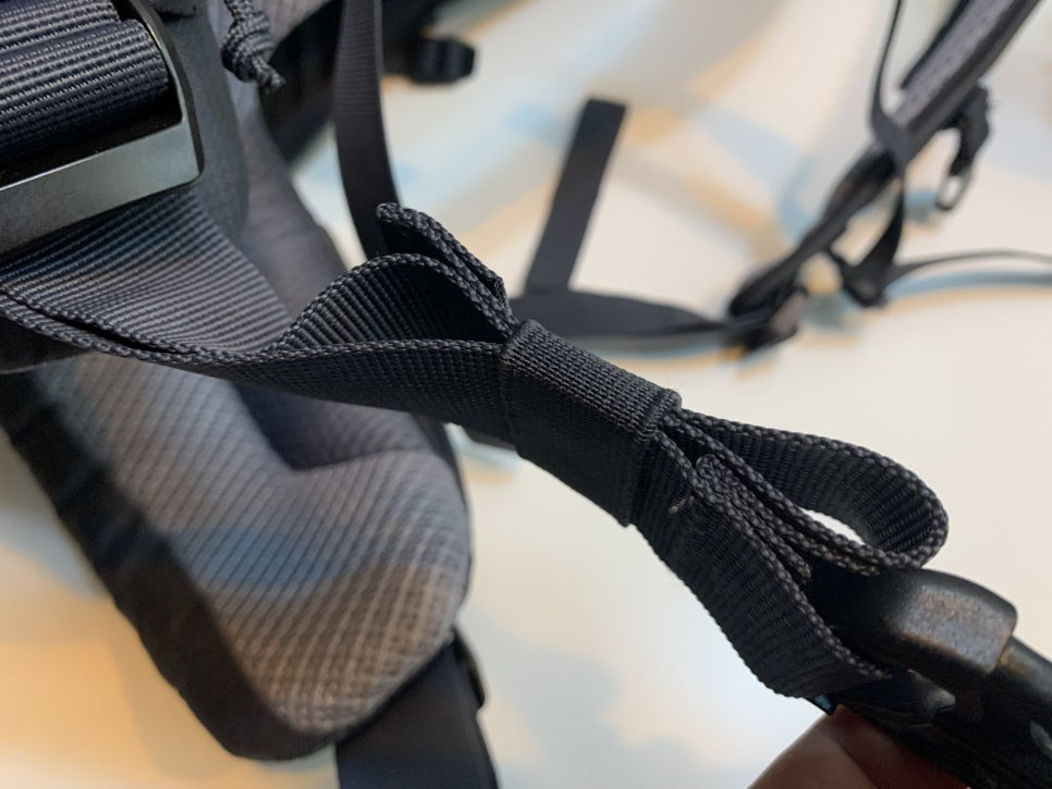 이건 가슴 벨트입니다. 배낭이 흔들리는 것을 막고 몸에 좀 더 밀착 되도록 해주는 역할을 합니다. 당연히 위아래로 조절이 가능하며 고리가 있어 필요에 따라서 가벼운 물건을 걸어서 수납할 수도 있습니다.