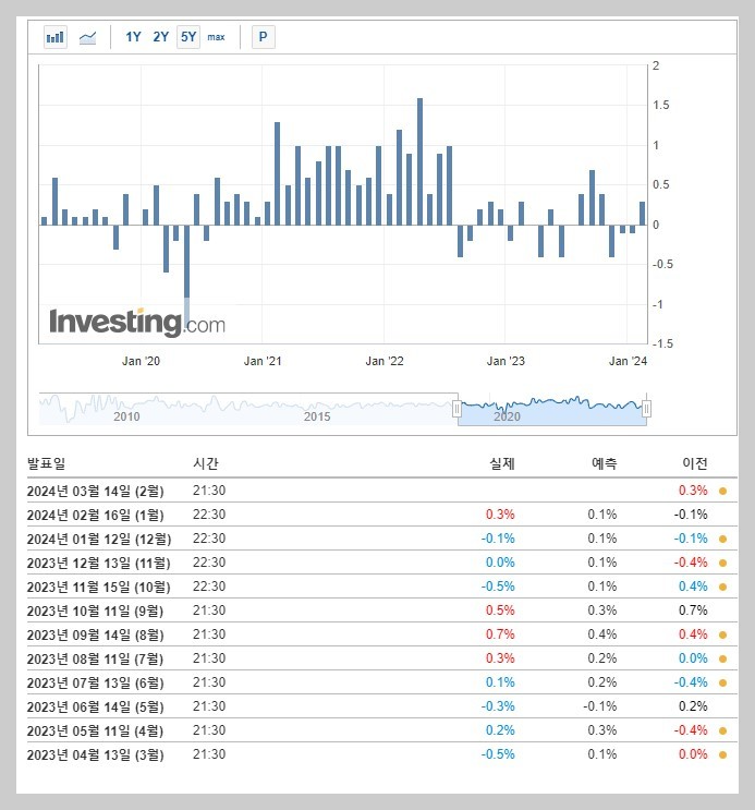 Investing.com에서 확인할 수 있는 PMI 지수입니다. 가장 최근인 2월 22일에 발표한 지수는 51.5로 앞으로의 경기 상황이 호조세를 이룰 것으로 예측할 수 있습니다.