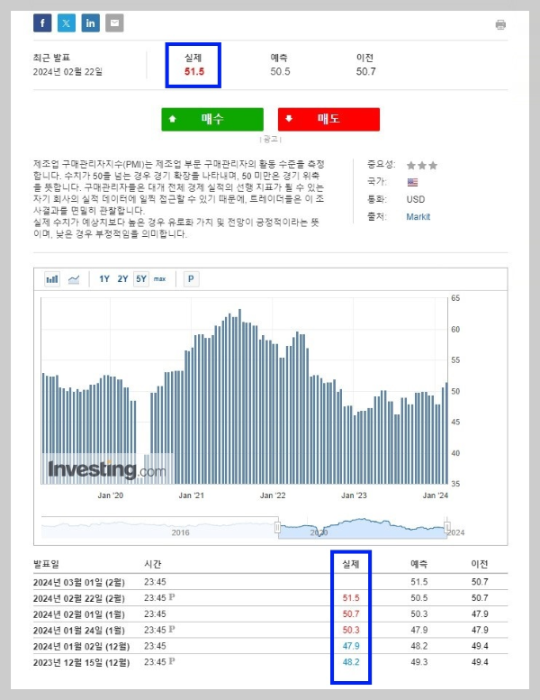 Investing.com에서 확인할 수 있는 PMI 지수입니다. 가장 최근인 2월 22일에 발표한 지수는 51.5로 앞으로의 경기 상황이 호조세를 이룰 것으로 예측할 수 있습니다.
