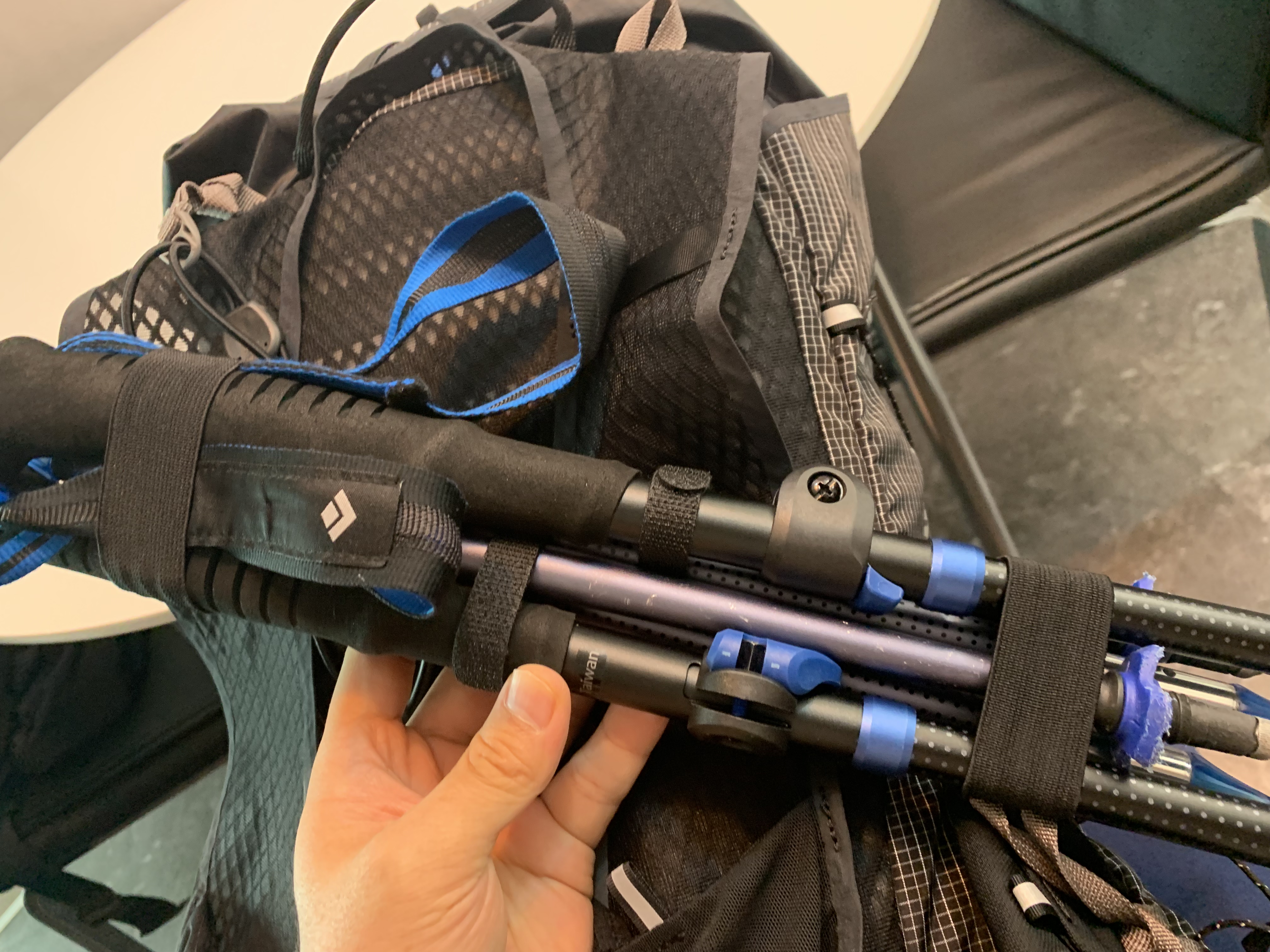 이렇게 생긴 장치입니다. 트레일 러닝용 베스트에서는 이렇게 되어있는 것을 본 적이 있는 것 같은데 실제로 디스턴스 배낭을 사용해 보면 이전의 Z폴 포켓에 일단 스틱을 꼽아두면 다시 꺼내기가 여간 귀찮은 게 아니었습니다. 참고로 도이터의 어센더는 정말 편하게 꺼낼 수 있다는 장점이 있었는데 그것에 비해 많이 아쉬웠던 문제를 이렇게 해결해 줬네요.