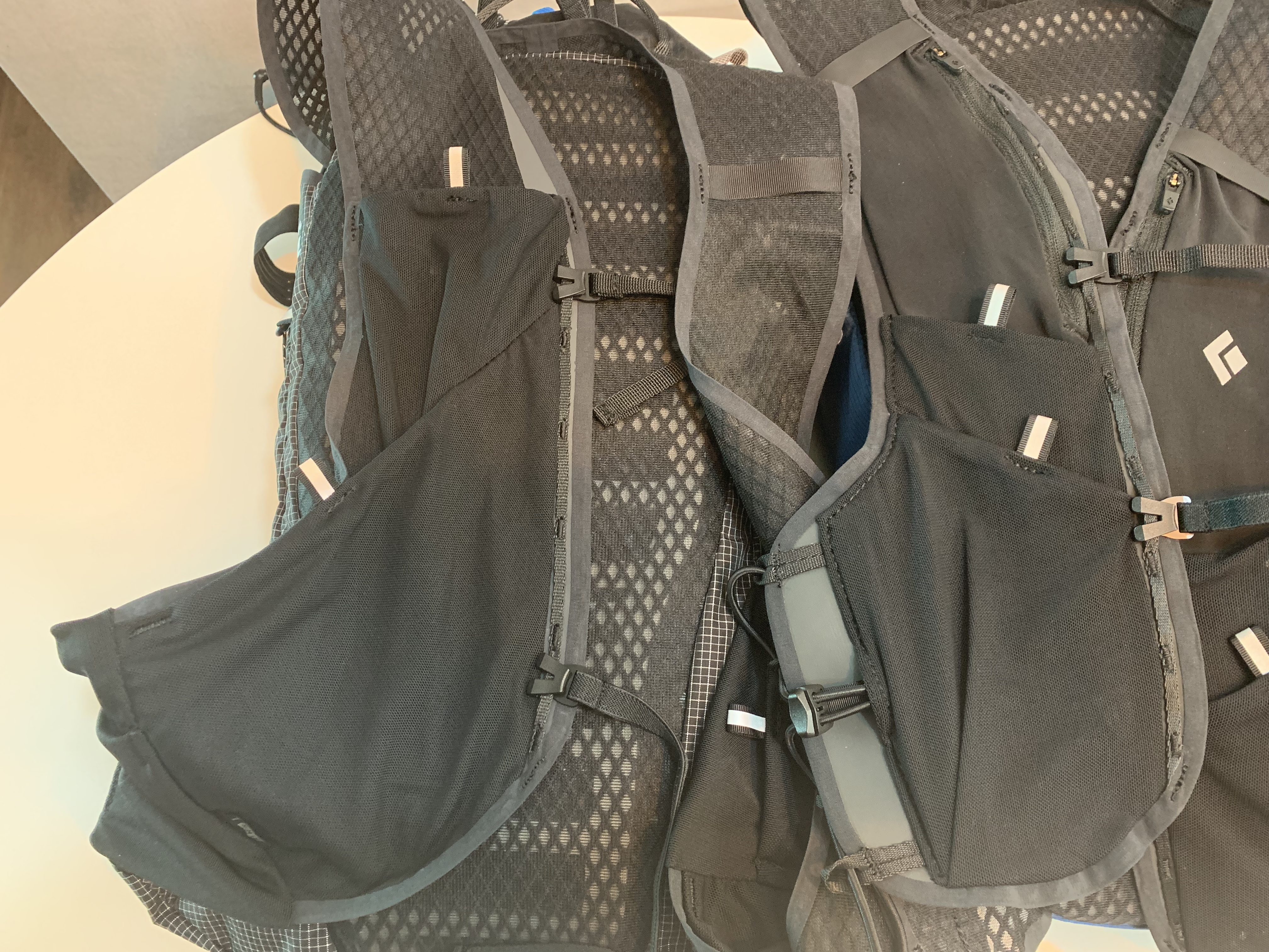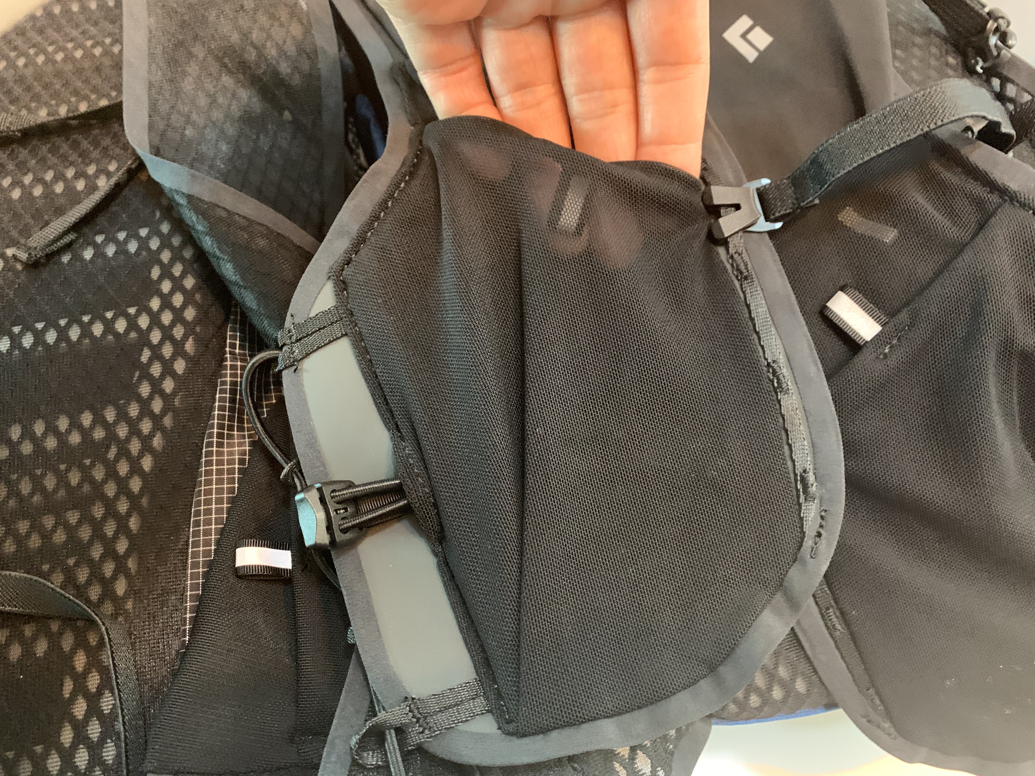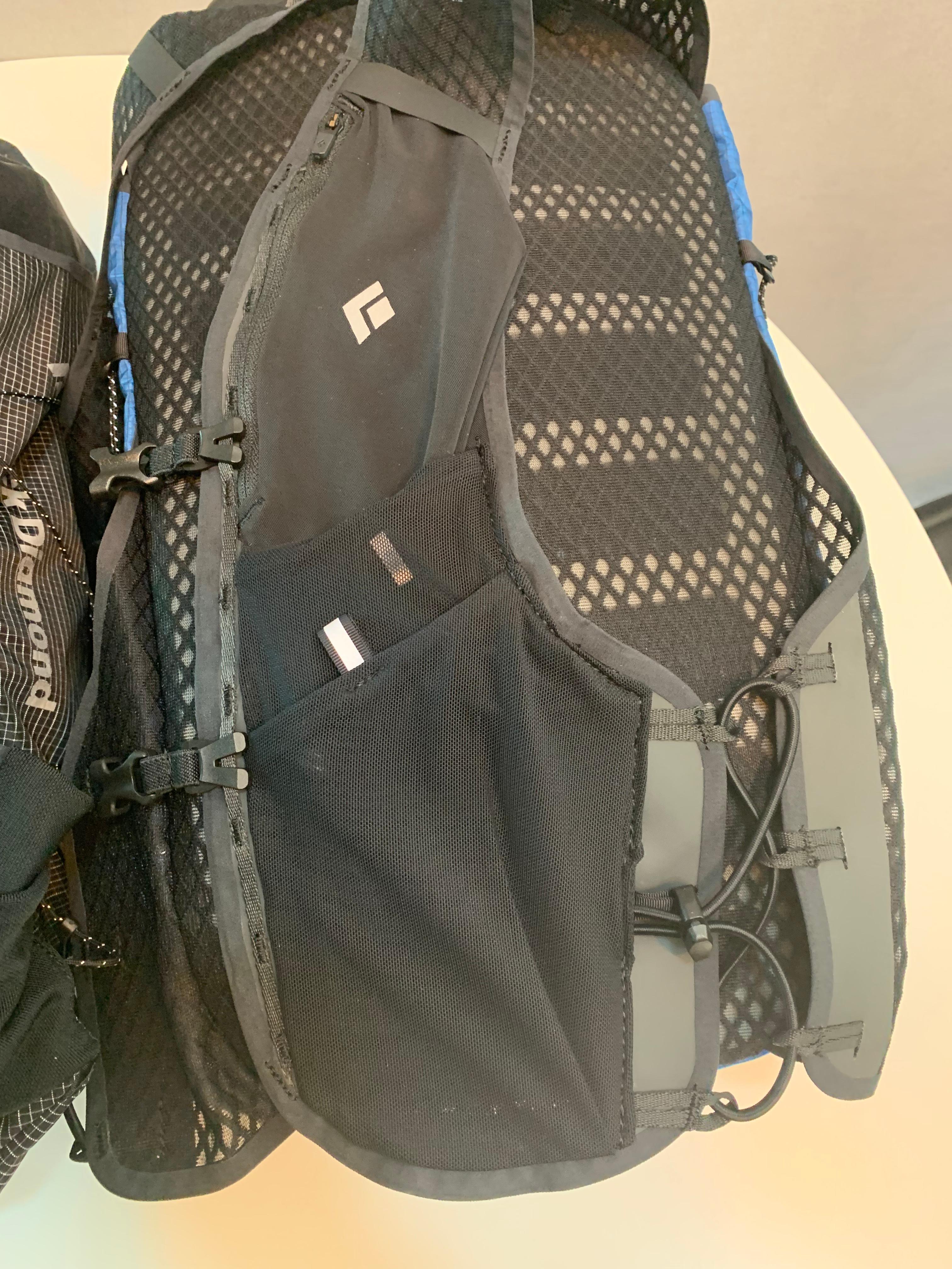 블랙다이아몬드의 설명에 따르면 소프트 플라스크를 넣는 포켓의 위치가 신형에서는 좀 더 위로 올라갔다고 하는데 그게 실제로 운행 중에 굳이 플라스크를 빼지 않고도 물을 마실 수 있다는 점에서 더 편리하다고 합니다. 저야 뭐 습관적으로 물을 마실 때는 항상 플라스크든 물병이든 뽑아서 벌컥벌컥 마시는 게 습관이 된 지라 어떨지는 모르겠지만 일단 이 밴낭을 메고 트레일 러닝을 하시는 분들이라면 무척이나 유용하게 느껴지실 수도 있겠습니다.