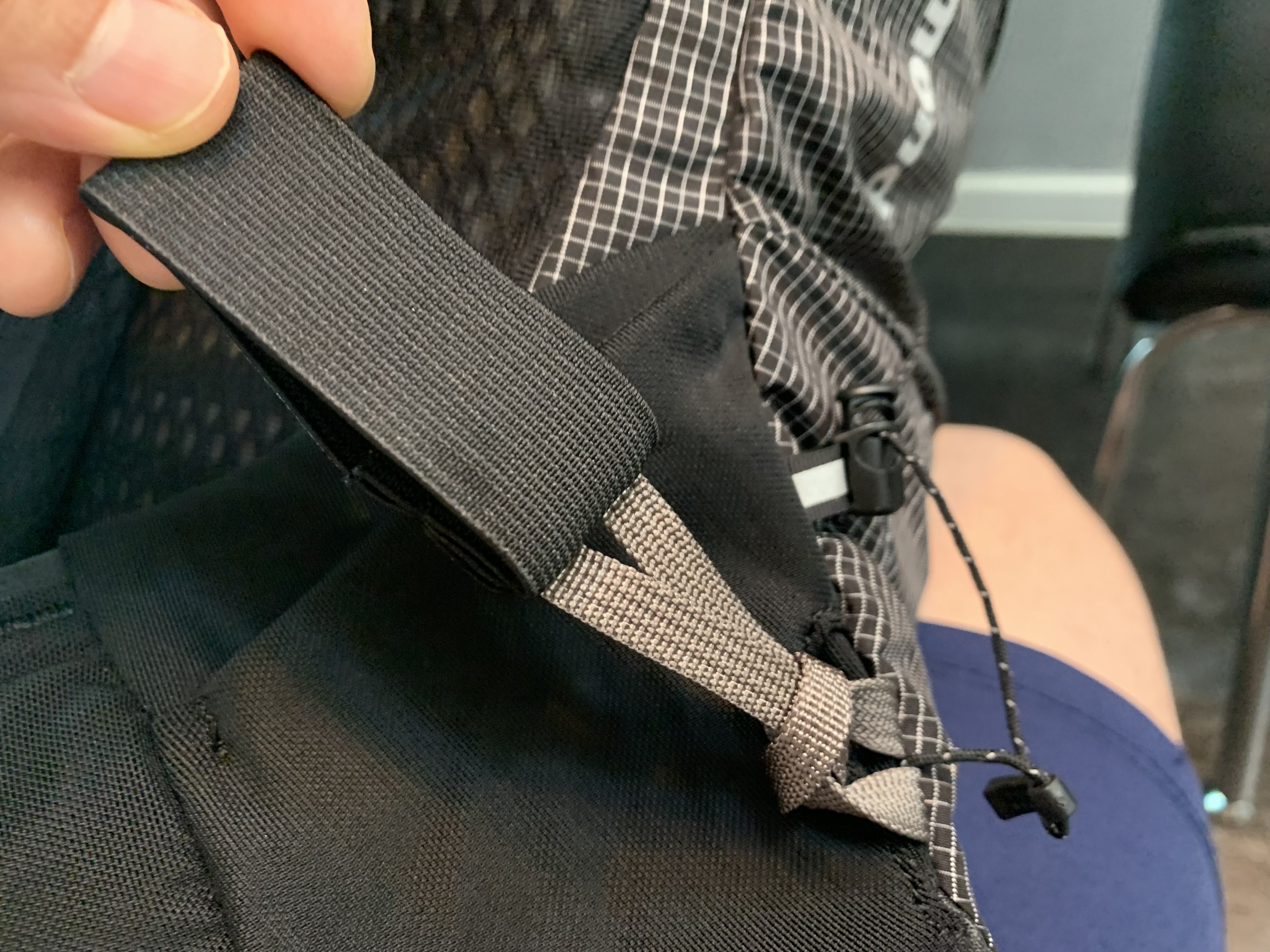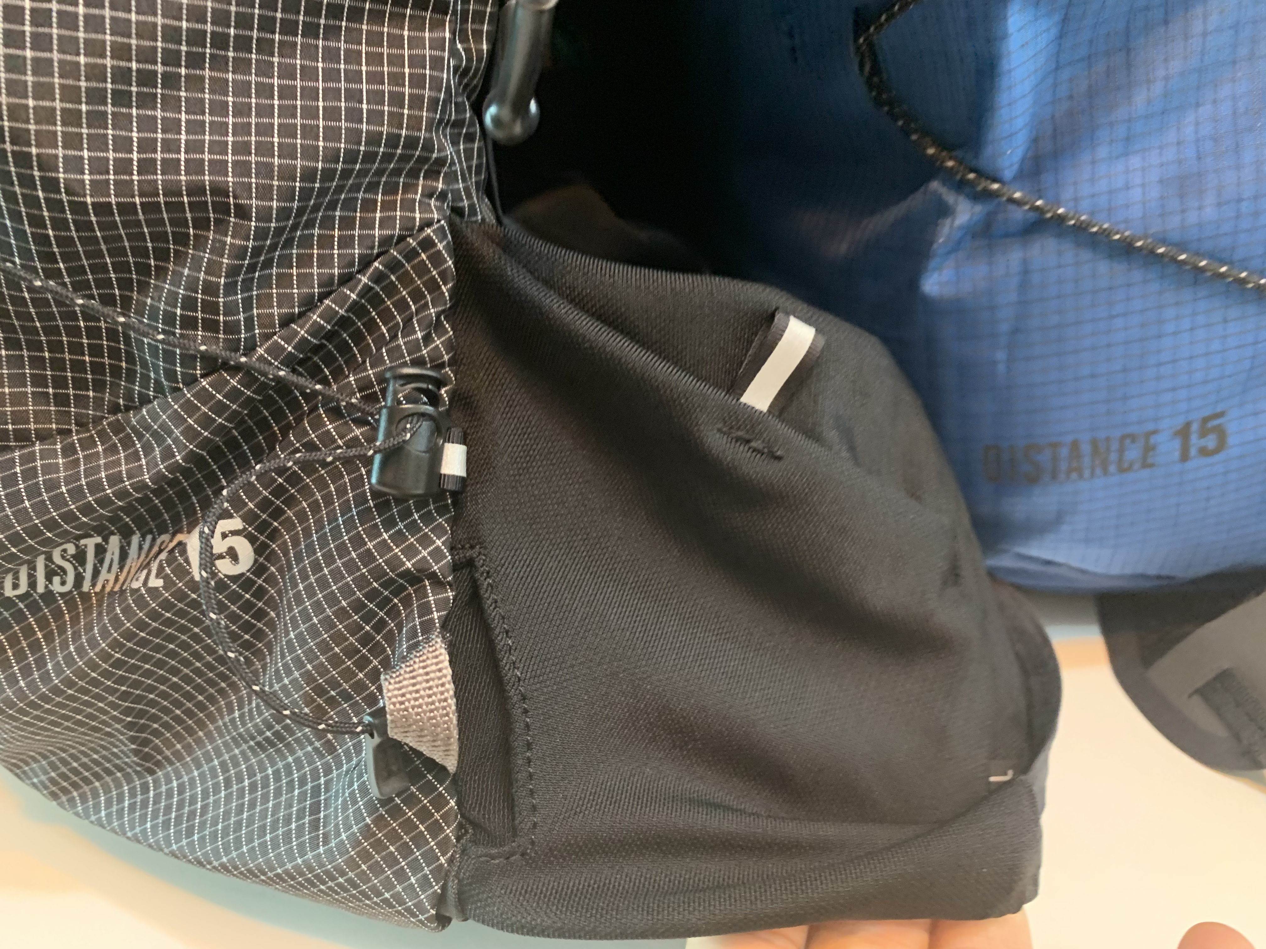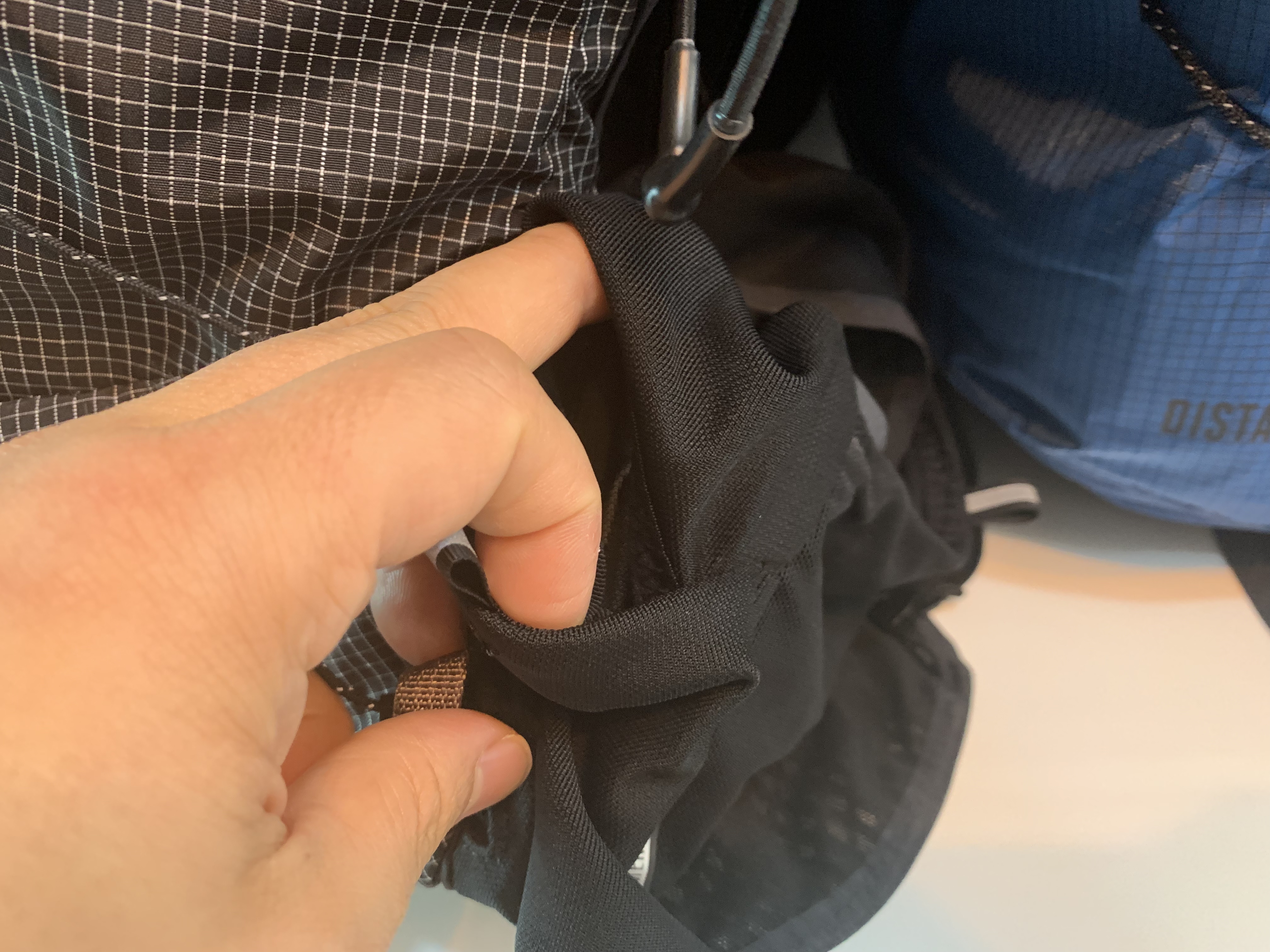 바로 기존 모델은 어깨끈 하단 부분이 탄성이 있는 엘라스틱 코드로 되어있는데 신형 디스턴스15에서는 이게 사라졌습니다. 아마 8리터 모델도 마찬가지일 것으로 예상됩니다. 그리고 그 부분에 작은 탄성 포켓이 설치되어 있습니다.