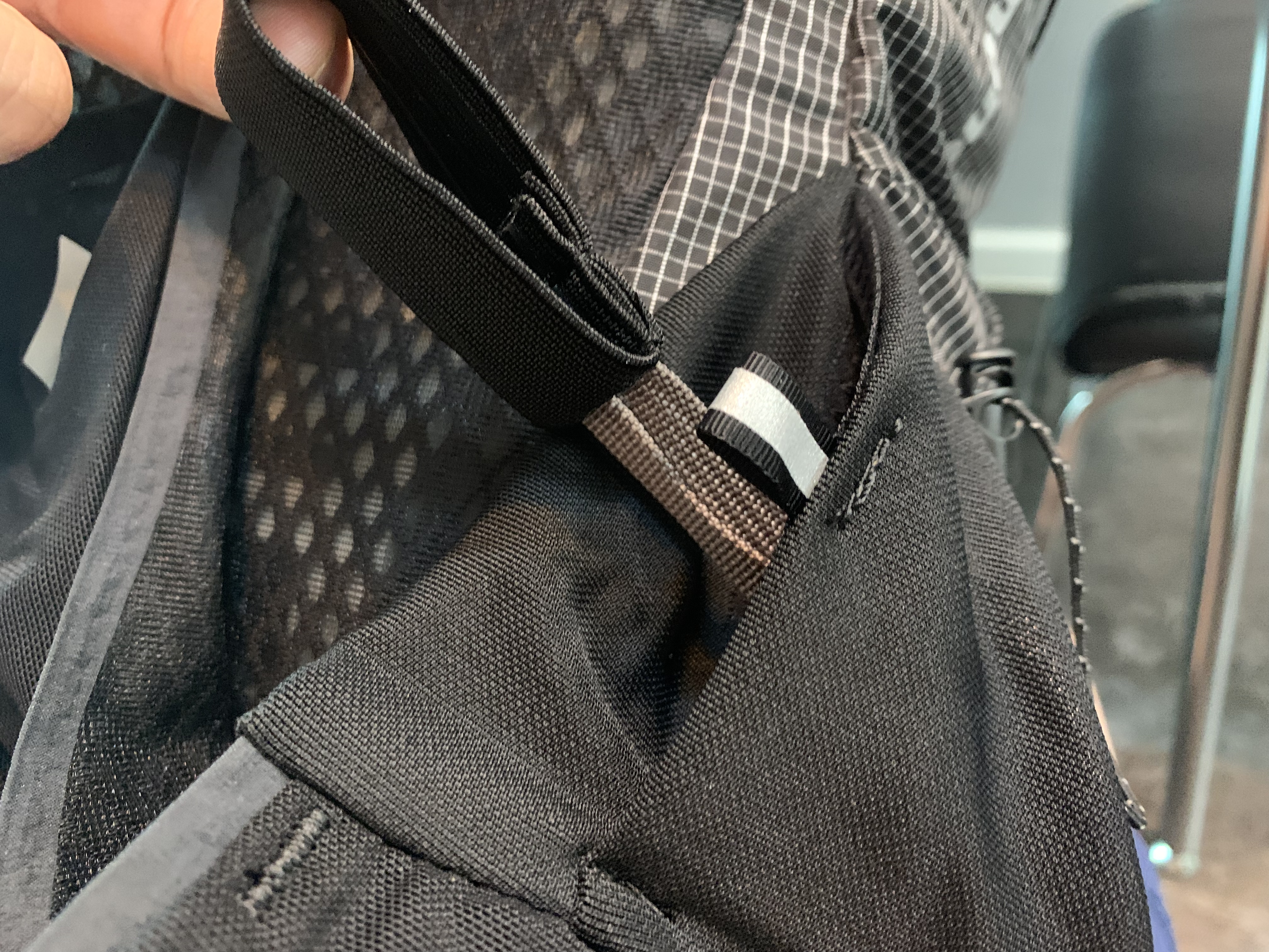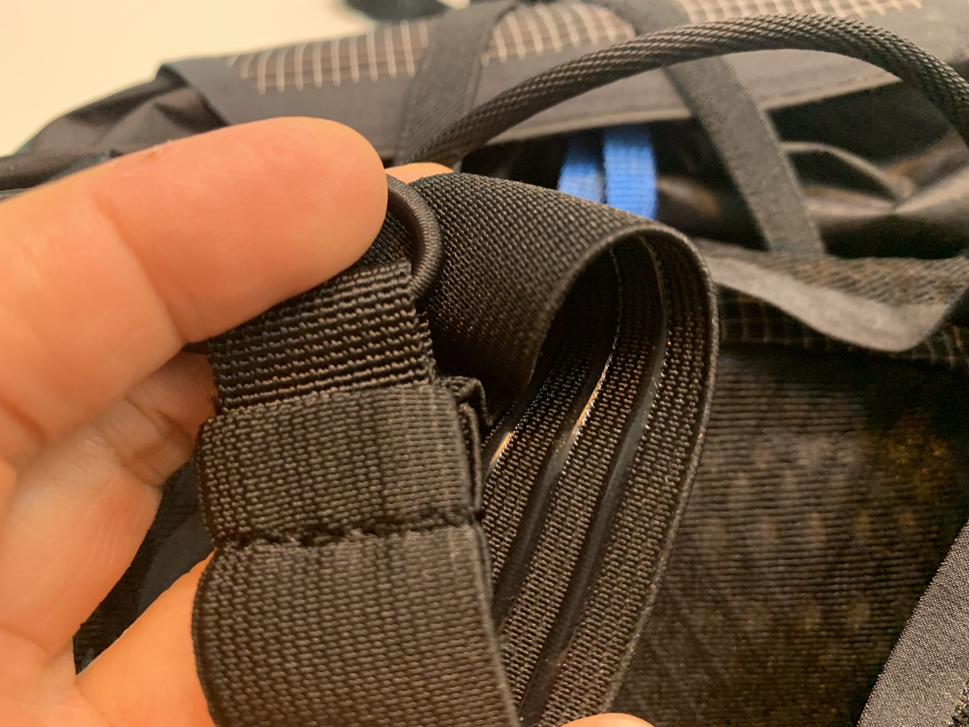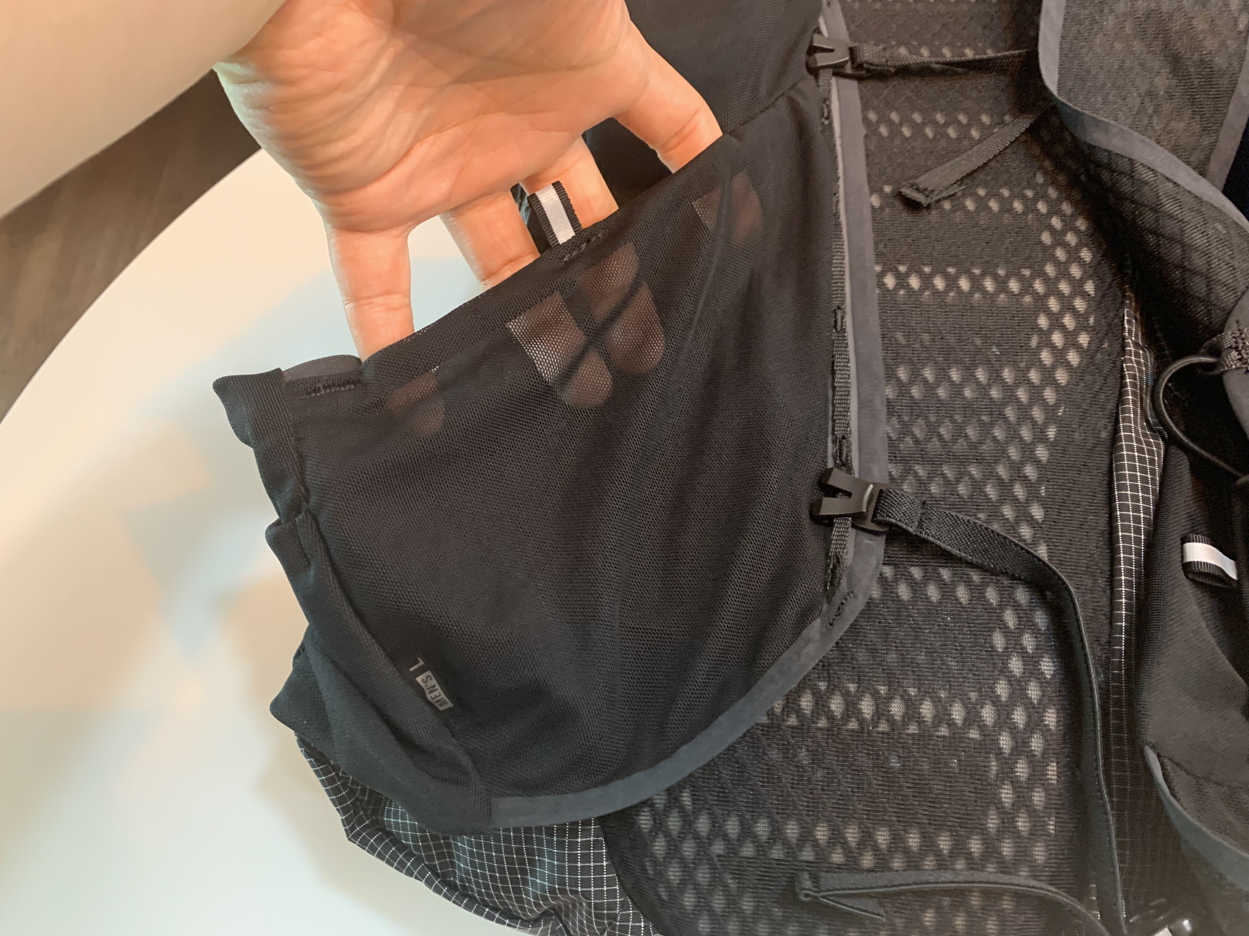 바로 기존 모델은 어깨끈 하단 부분이 탄성이 있는 엘라스틱 코드로 되어있는데 신형 디스턴스15에서는 이게 사라졌습니다. 아마 8리터 모델도 마찬가지일 것으로 예상됩니다. 그리고 그 부분에 작은 탄성 포켓이 설치되어 있습니다.