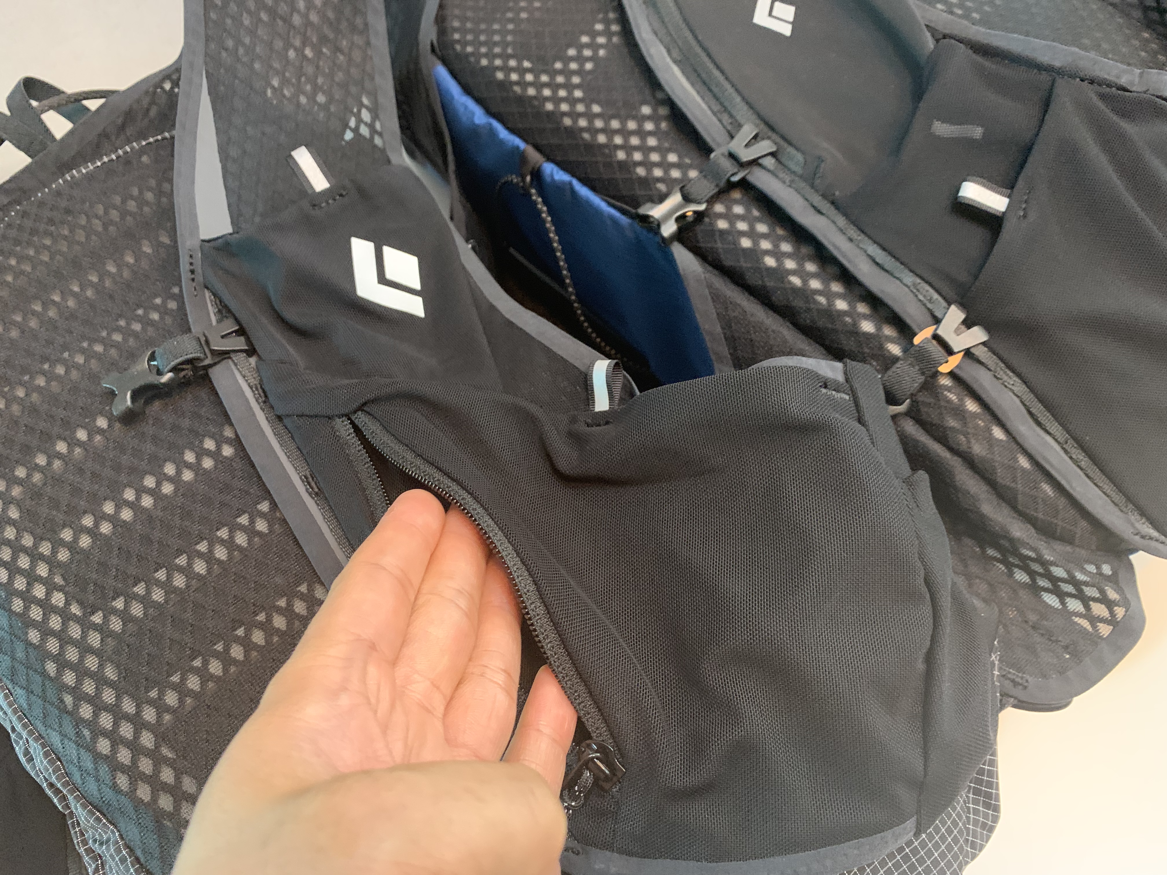 일단 가장 상단에는 소프트 플라스크를 넣는 포켓이 있고 바로 밑에 있는 포켓에는 기타 장비 또는 수시로 꺼내 쓸 수 있는 물건들, 즉 행동식이나 티슈 같은 것들을 보관하기 좋게 되어있습니다. 포켓의 모양이 이전의 디스턴스 팩과는 다소 차이가 있는데 더 넓어지고 안정적으로 개선된 느낌입니다. 특히 가로로 넓어져서 이런저런 물건들을 넣고 꺼내기에 좋아졌습니다.