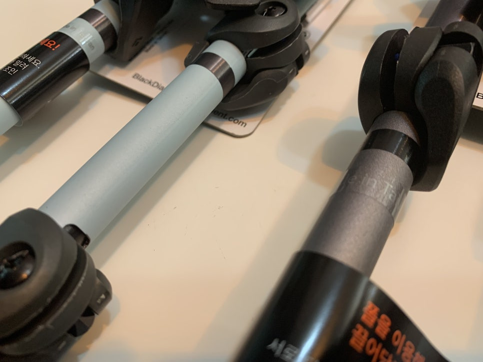 얼핏 보면 다크 그레이 컬러가 있지만 은은하게 보랏빛이 도는 색입니다. 보라색을 선호하지 않지만 이 정도면 뭐 나쁘지 않은 것 같습니다. 최대 길이는 140cm라서 신장이 크신 분들이 사용하면 적당하겠지만 반대로 신장이 작으신 분들도 길이를 짧게 조절해서 사용하는 게 얼마든지 가능합니다. 어차피 두 제품 모두 최단 길이는 100cm로 동일합니다.