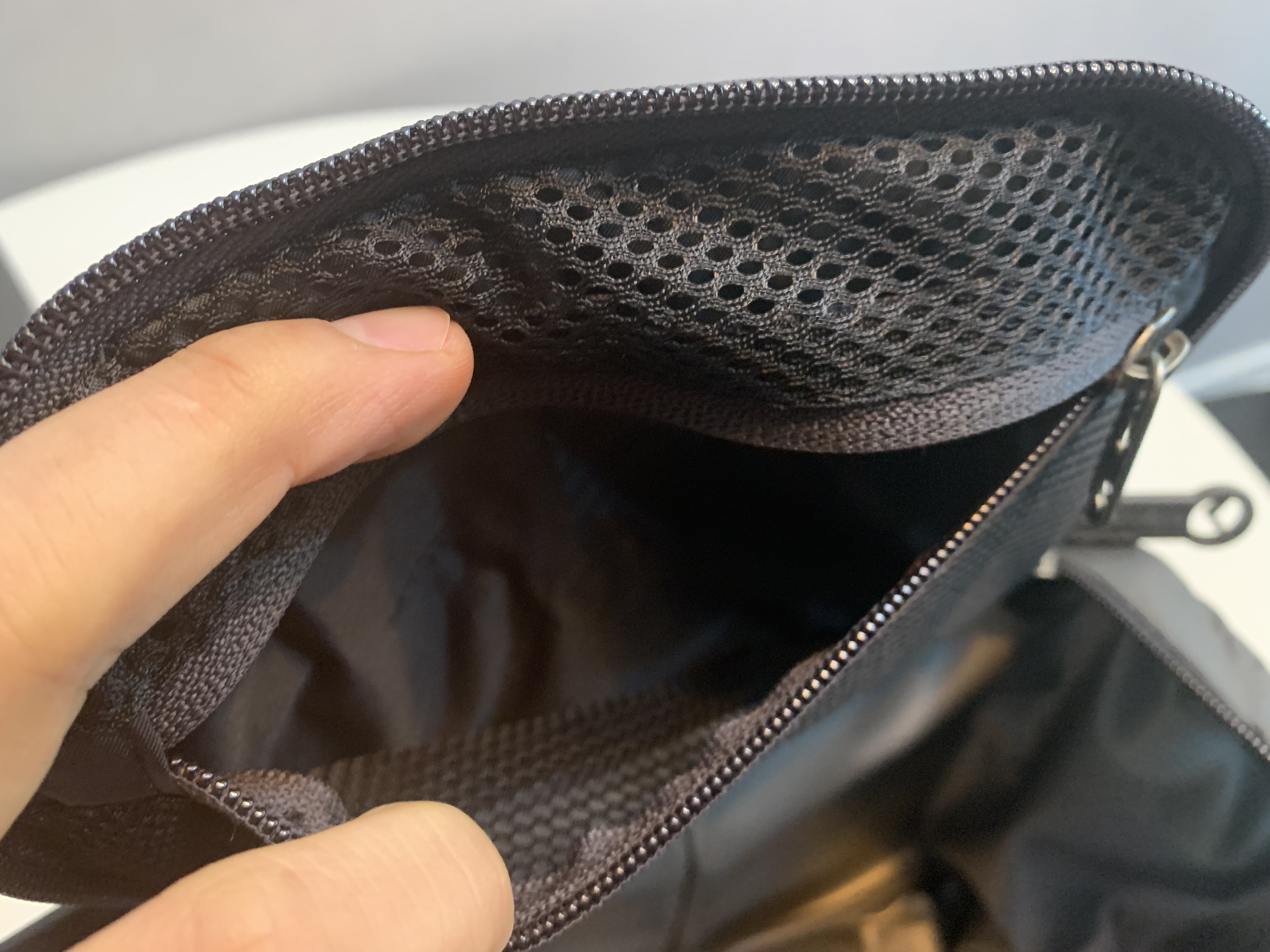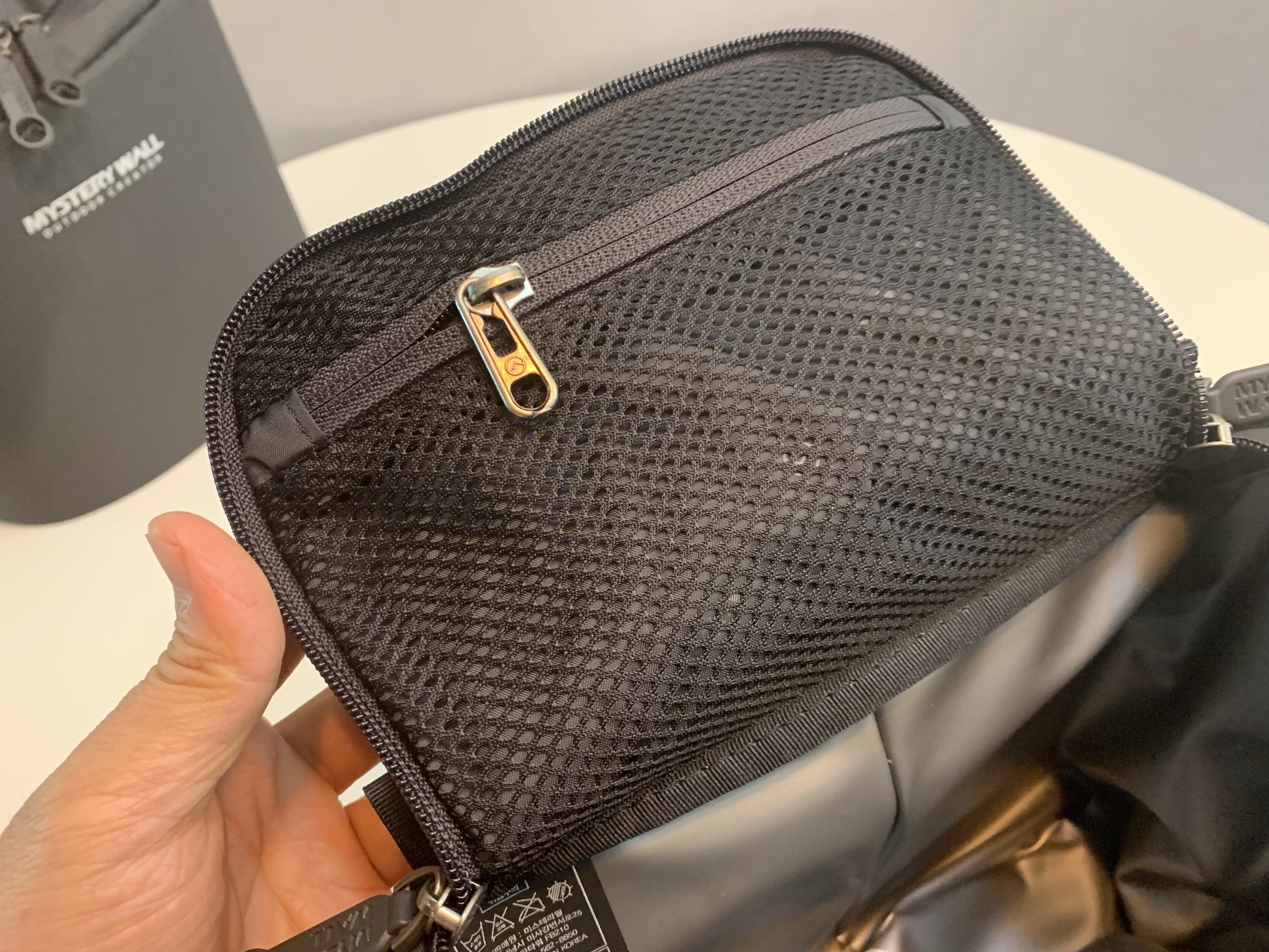뚜껑을 열면 위에 이렇게 메쉬로 된 파우치가 있습니다. 식사 후 간단히 먹을 간식이나 티백, 커피믹스 같은 것을 넣거나 아니면 쓰레기를 담을 비닐봉지를 넣고 다녀도 좋을 공간입니다. 저는 실제로 그렇게 활용하고 있고요.