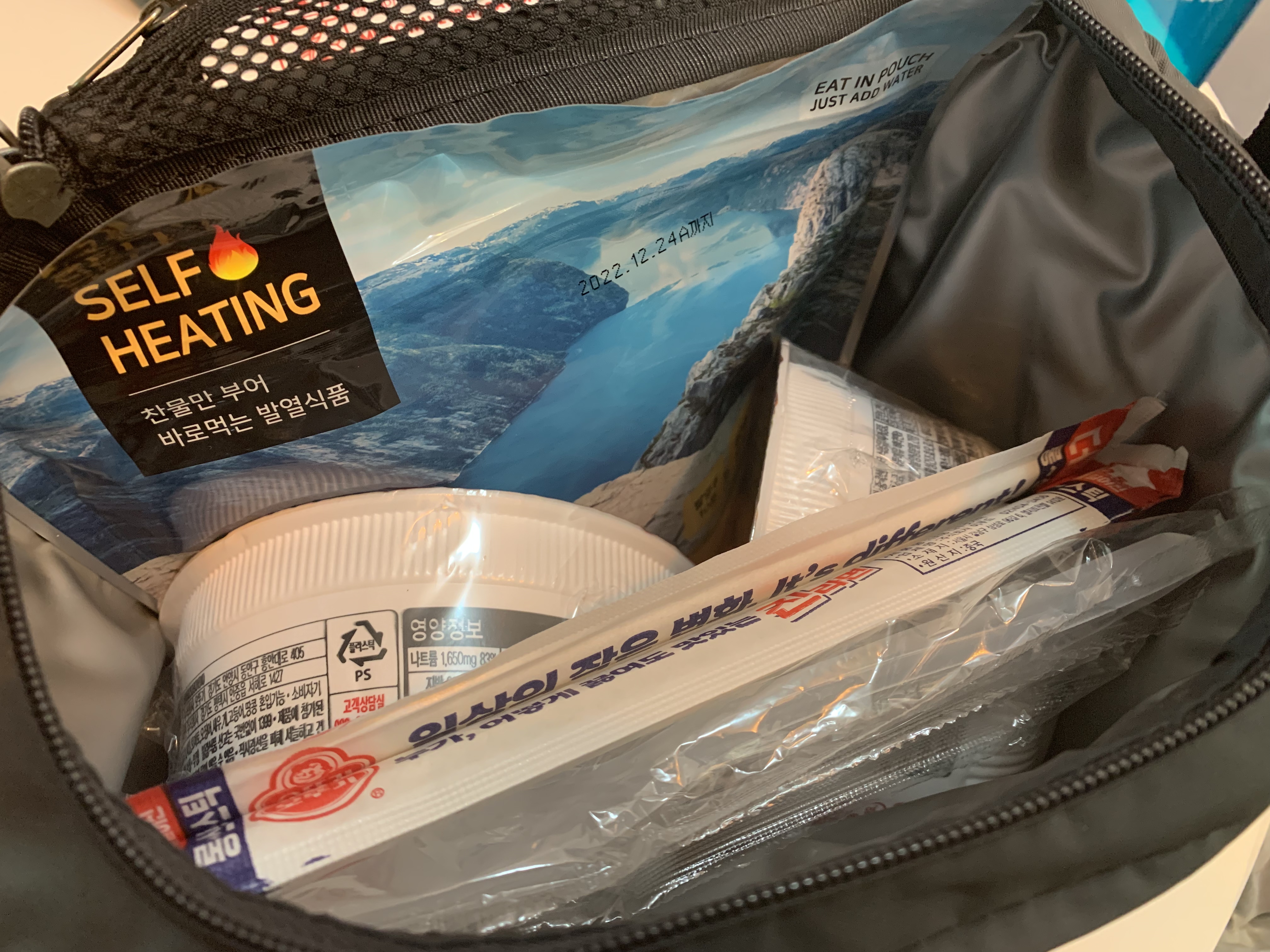 보온 보냉 기능이 있지만 이렇게 일반적인 수납 용도로도 사용이 가능합니다. 중간 크기의 컵라면 두 개와 간편식 한 개를 넣어봤는데 좀 욱여넣으면 간편식이 모두 두 개는 들어갈 것으로 보입니다. 저는 급하게 테스트를 할 겸 음식으로만 채워봤지만 어느 다른 분의 후기를 보니 굳이 음식이 아닌 카메라와 같은 전자기기를 넣고 다니시기도 하고 아이젠이나 스패츠 같은 용품은 물론 젖은 옷을 보관하는 데도 좋다고 합니다. 그만큼 배낭 내부를 깨끗하고 단정하게 수납하는데 유용하게 쓰일 수 있을 것 같습니다.