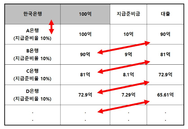 A은행이 한국은행이 발행한 100억을 대출받은 후 지급준비율에 의해 10억은 중앙은행에 적립하게 됩니다. 이후 나머지 90억은 대출로 운용하게 됩니다. 마찬가지로 A은행에서 90억을 대출받은 B은행은 9억을 적립하고 나머지 81억을 대출로 운용하게 됩니다.