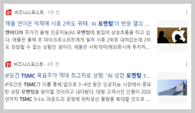 위의 기사는 AI와 관련된 성장 모멘텀을 엔비디아와 TSMC가 가지고 있다는 기사입니다. 이와 마찬가지로 또 다른 예를 들어보면 제약회사에 개발하는 비만약에 대한 임상실험의 결과가 발표되었거나 수요가 폭증하고 있다는 소식은 주가의 상승에 기여하는 모멘텀이 될 수 있습니다.