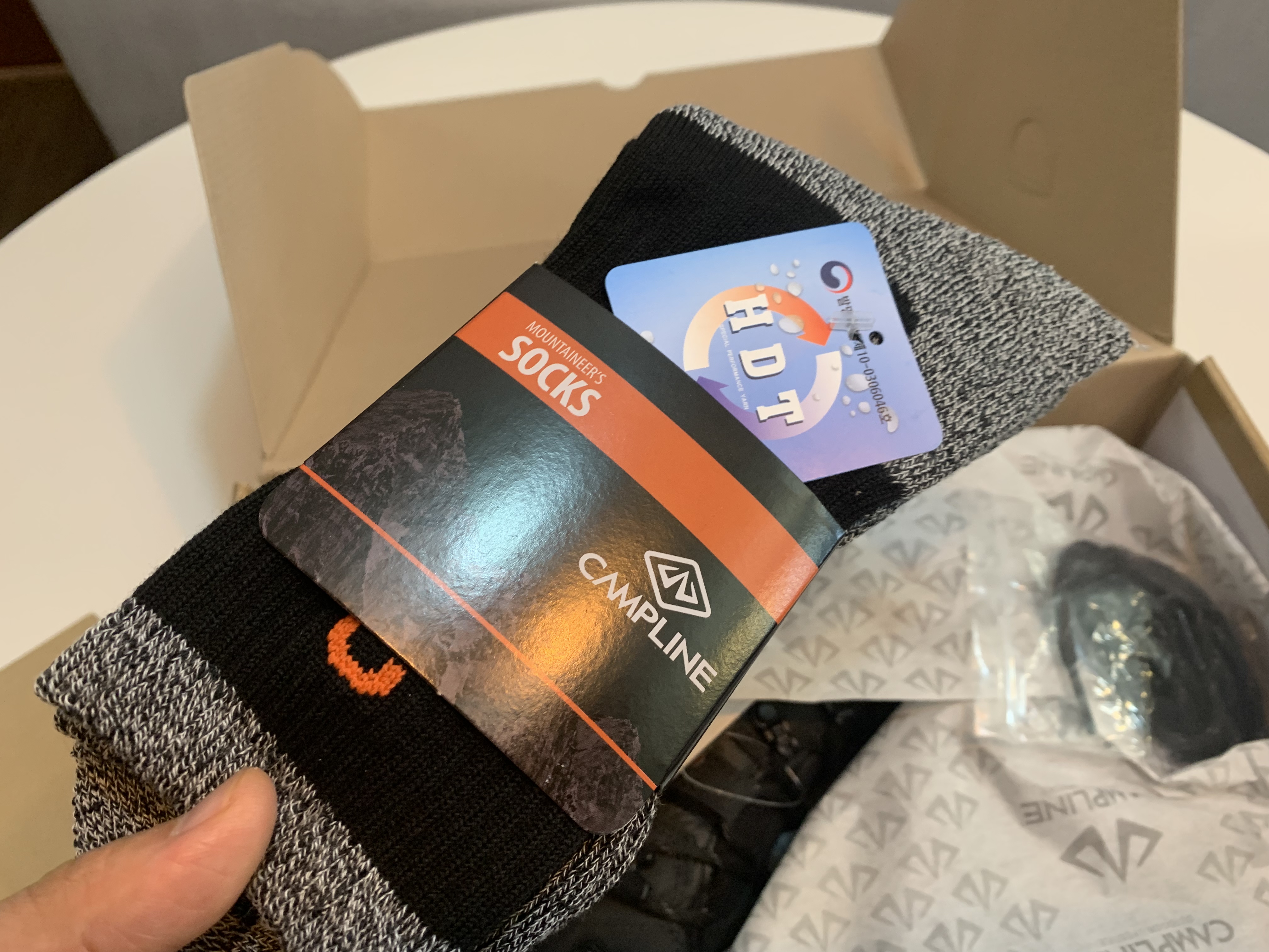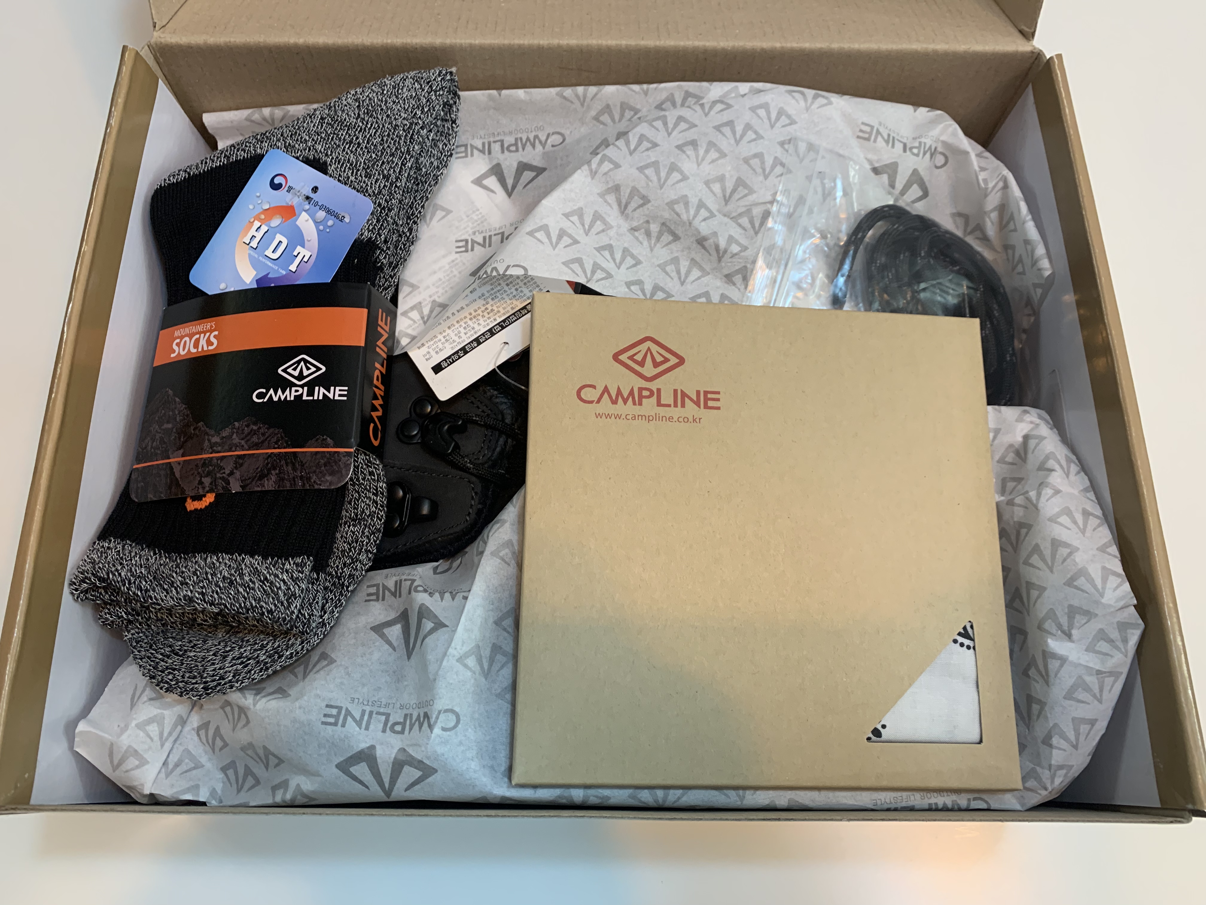 상자를 열면 여러 증정품이 있습니다. 사실 양말은 어느 등산화를 구입해도 주는 것이라고 하겠지만 그래도 이렇게 공짜로 하나 챙겨 받으면 그렇게 기분이 좋을 수 없네요. 그뿐만 아니라 스카프나 반다나로 쓸 수 있는 면 소재의 수건도 있습니다. 땀쟁이인 저한테는 요긴하게 쓸 수 있는 아이템입니다.