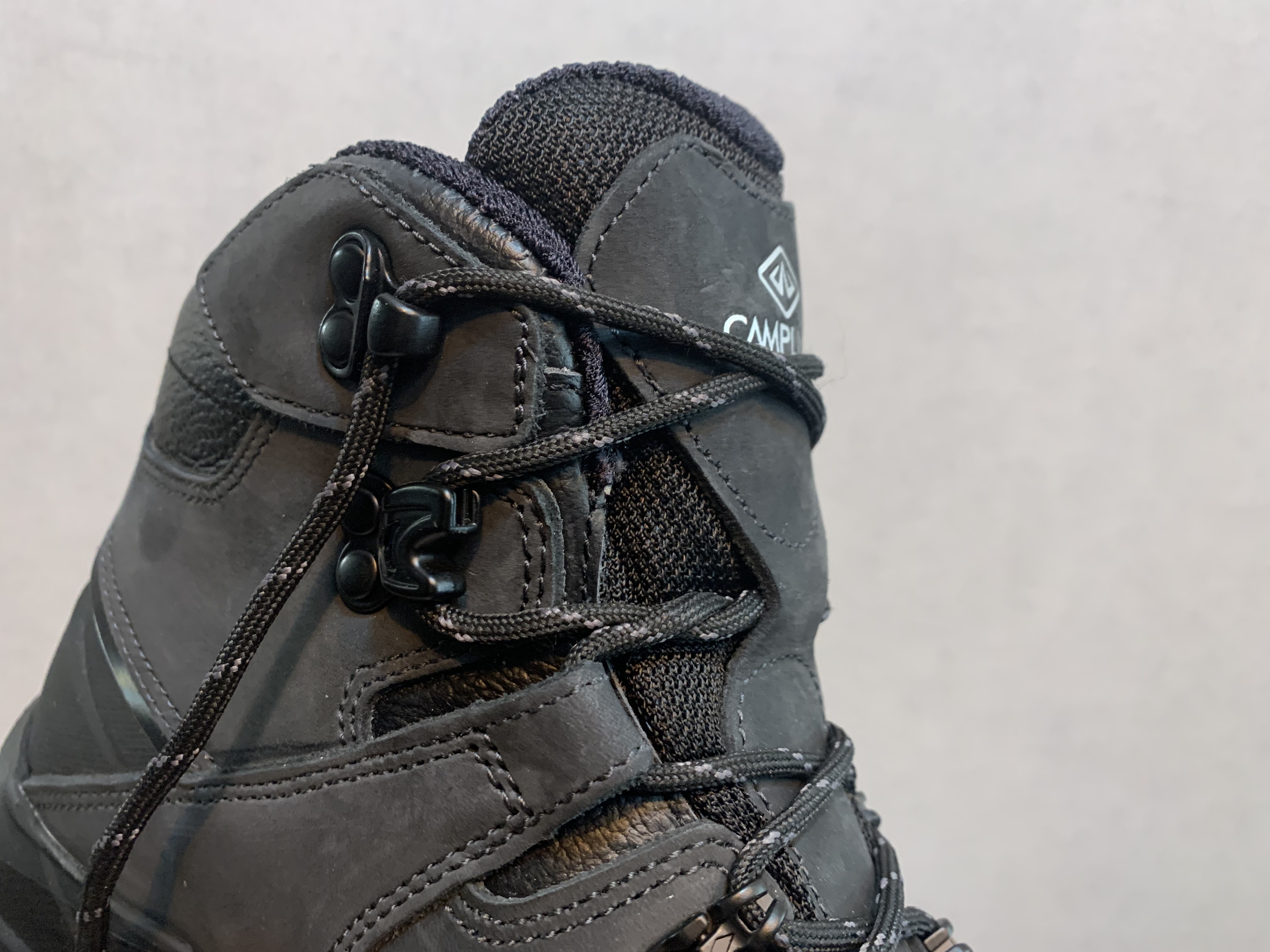색상은 차콜이라고 하지만 거의 블랙에 가깝습니다. 지난 세대까지만 해도 토캡 외측에 있는 흰색으로 된 캠프라인 로고가 이번 오메가 버전부터는 검은색으로 바뀌어서 신발의 전체적인 이미지가 더 단정하고 심플한 느낌이 듭니다. 물론 흙먼지가 날리는 산에서는 아무래도 좀 더 지저분해 보일 수도 있다는 단점이 있지만 개인 취향으로 다크 브라운 색상보다는 더 마음에 드는 색상과 디자인입니다.
