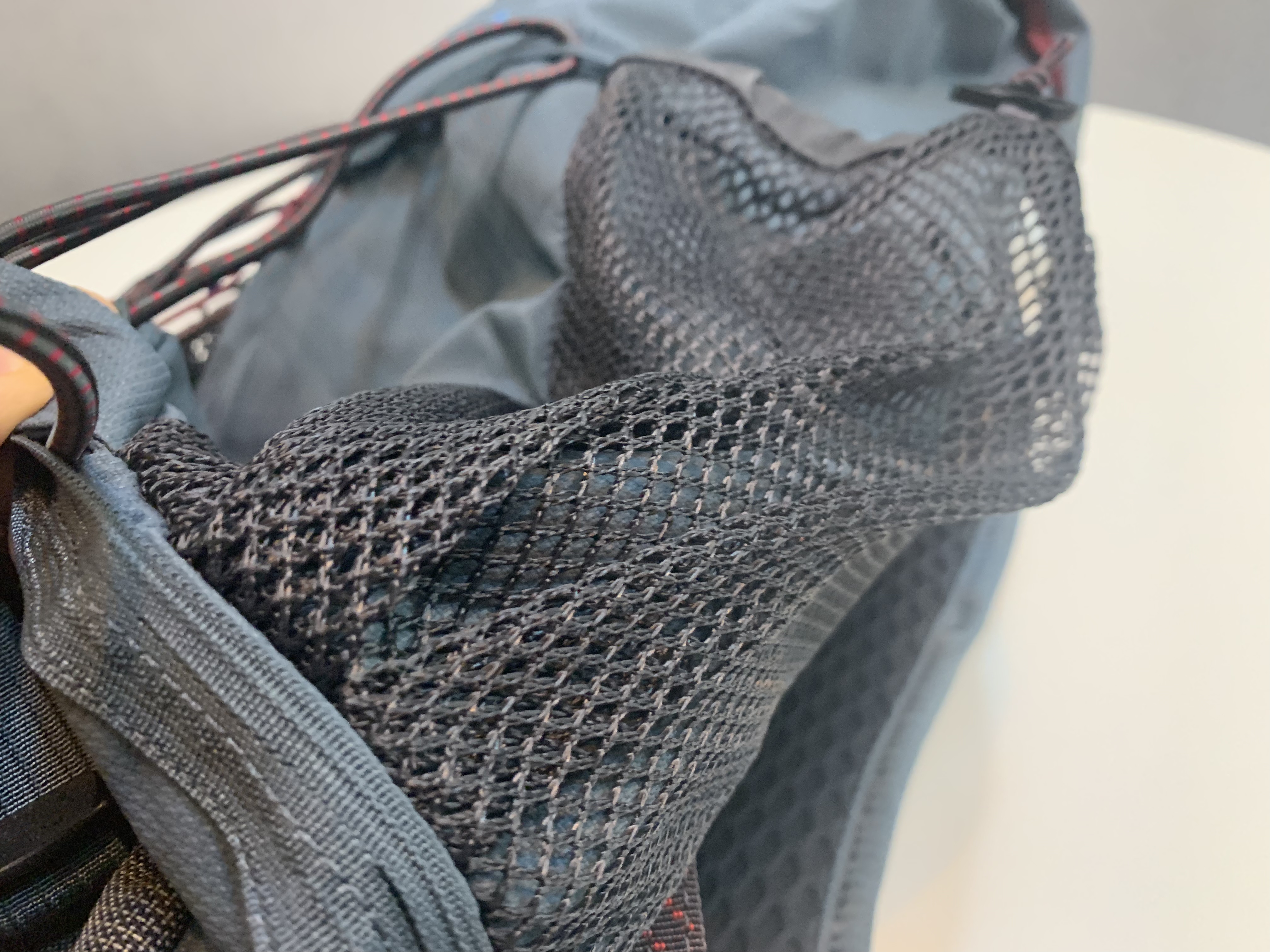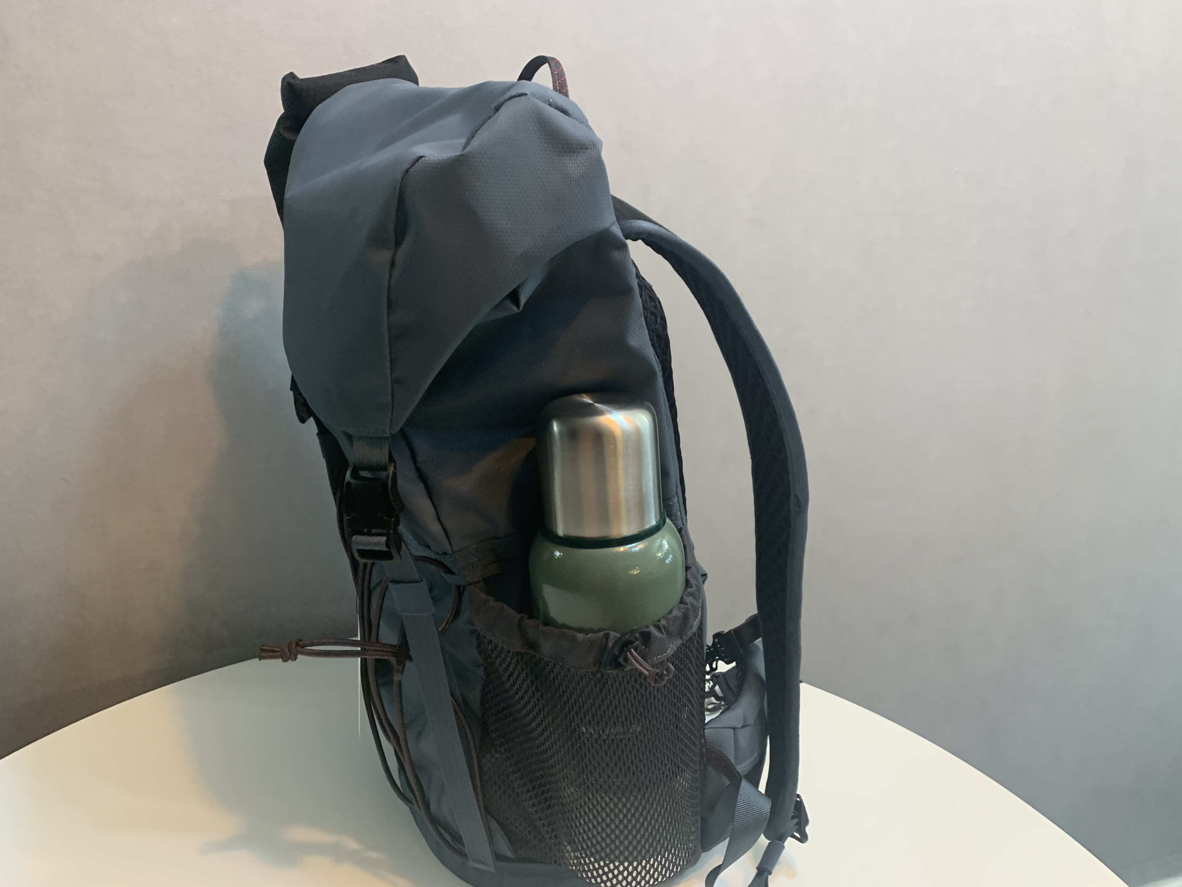사이드포켓입니다. 탄성이 있는 소재가 아니라 일반적인 메쉬 형태의 포켓입니다. 포켓의 윗부분만 클립으로 조였다 풀 수 있는 구조로 되어있습니다. 사실 저는 보통의 배낭에서는 사이드포켓을 잘 사용하지 않습니다. 사용하더라도 그렇게 부피가 큰 물건은 넣지 않는데 이유는 나중에는 결국 포켓이 늘어나게 되더라고요. 그런데 델링은 그런 걱정 없이 필요한 물건을 언제든 넣고 다닐 수 있을 것 같습니다.