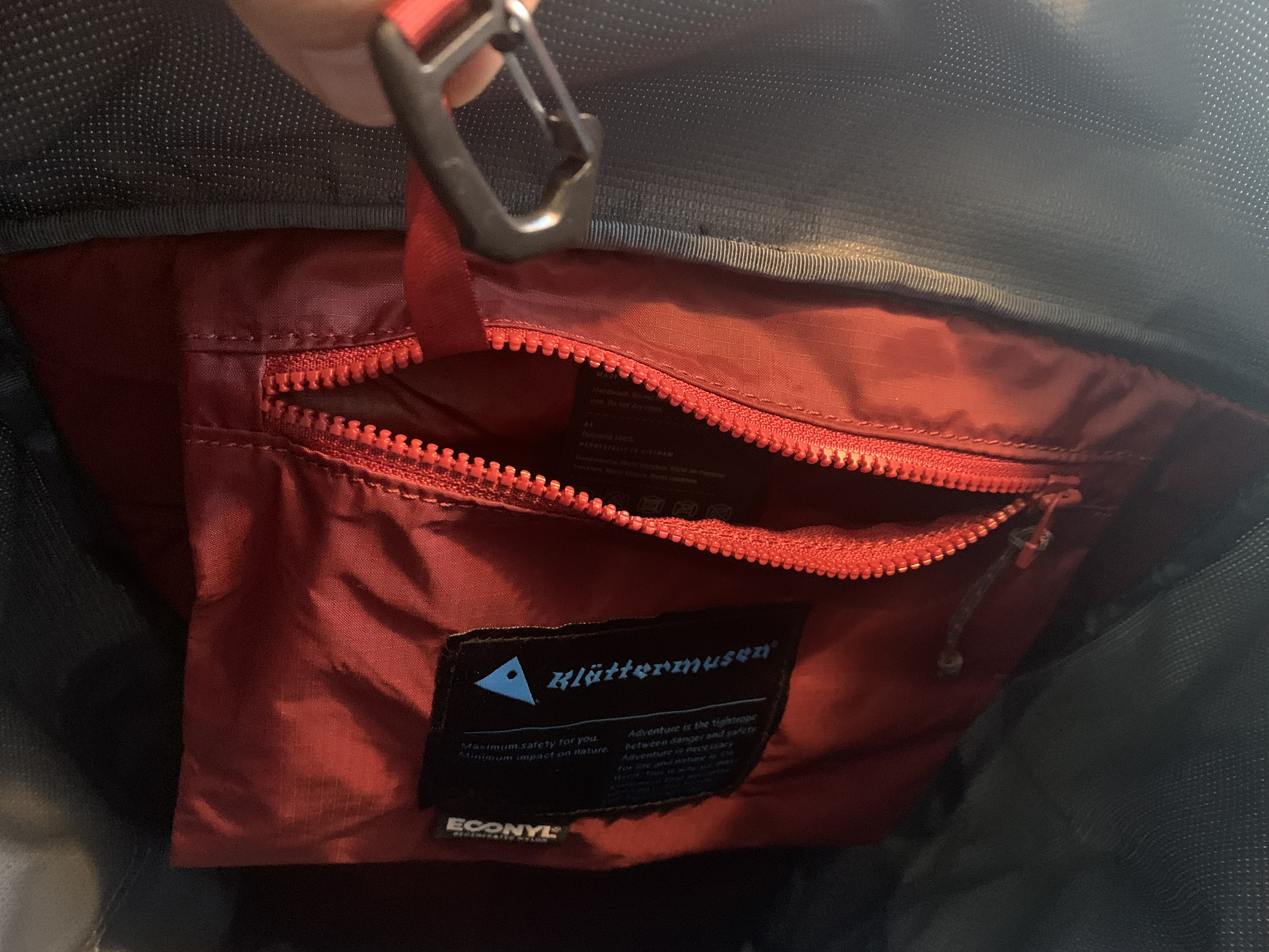 배낭의 내부입니다. 후드형 배낭답게 원통형으로 널찍합니다. 그리고 수낭을 보관하고 걸 수 있는 공간도 마련되어 있습니다. 내부 포켓에는 현금이나 카드와 같은 귀중품을 보관할 수 있으며 키클립이 있습니다.