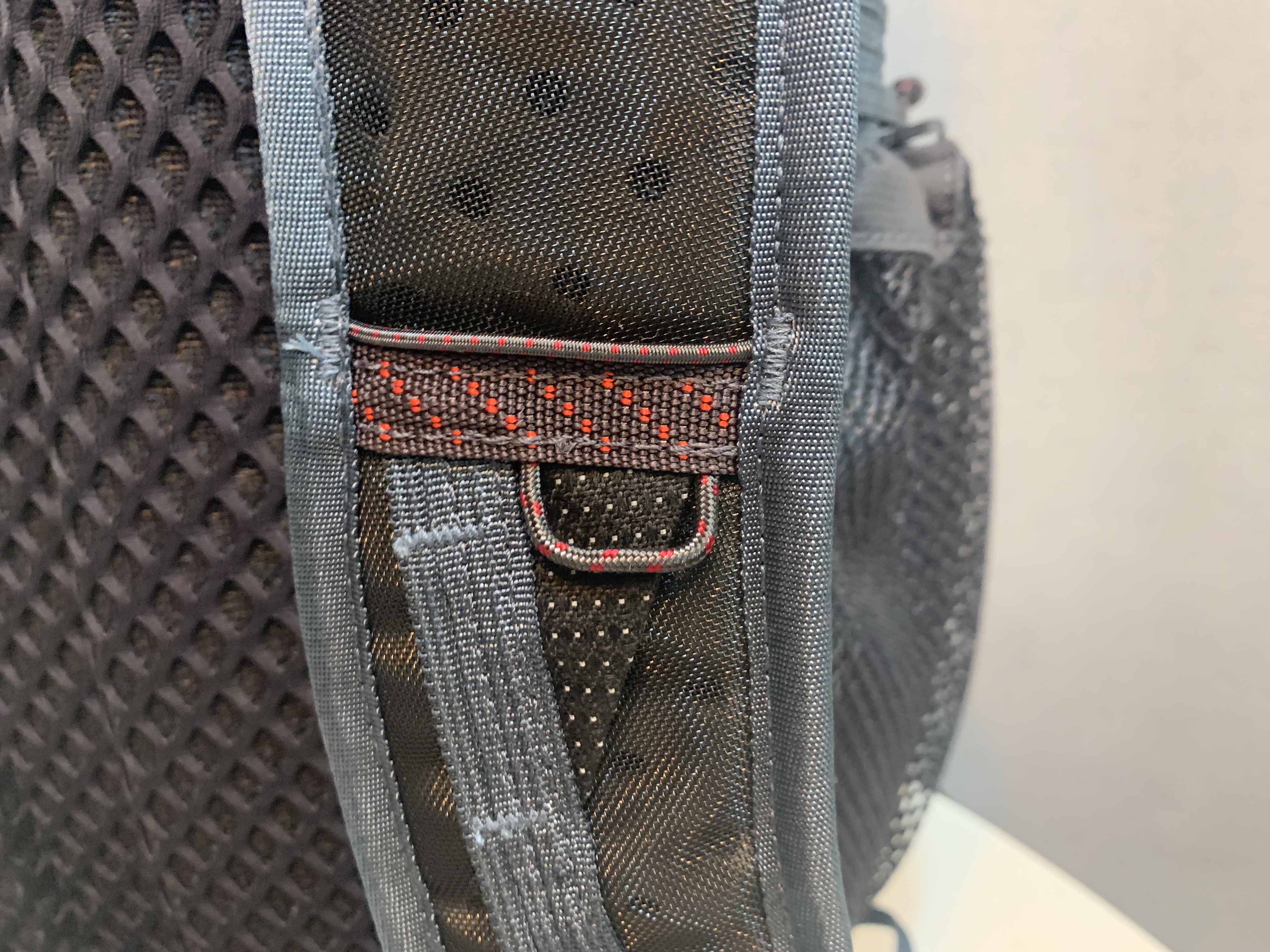 가끔 사이드포켓에 넣은 짐이 떨어질까 불안하신 분들은 위의 사진에 보이는 구멍에 별도의 스트랩을 사용해서 물건을 한 번 더 고정하는 것으로 알고 있습니다. 사실 사진과 같은 구조가 델링의 정면에 보이는 스트링뿐만 아니라 어깨 끈에도 있는 구조인데 사용자가 원하는 대로 짐을 고정할 수 있도록 해주는 기능이라 유용하게 커스터마이징할 수 있을 것으로 생각됩니다.