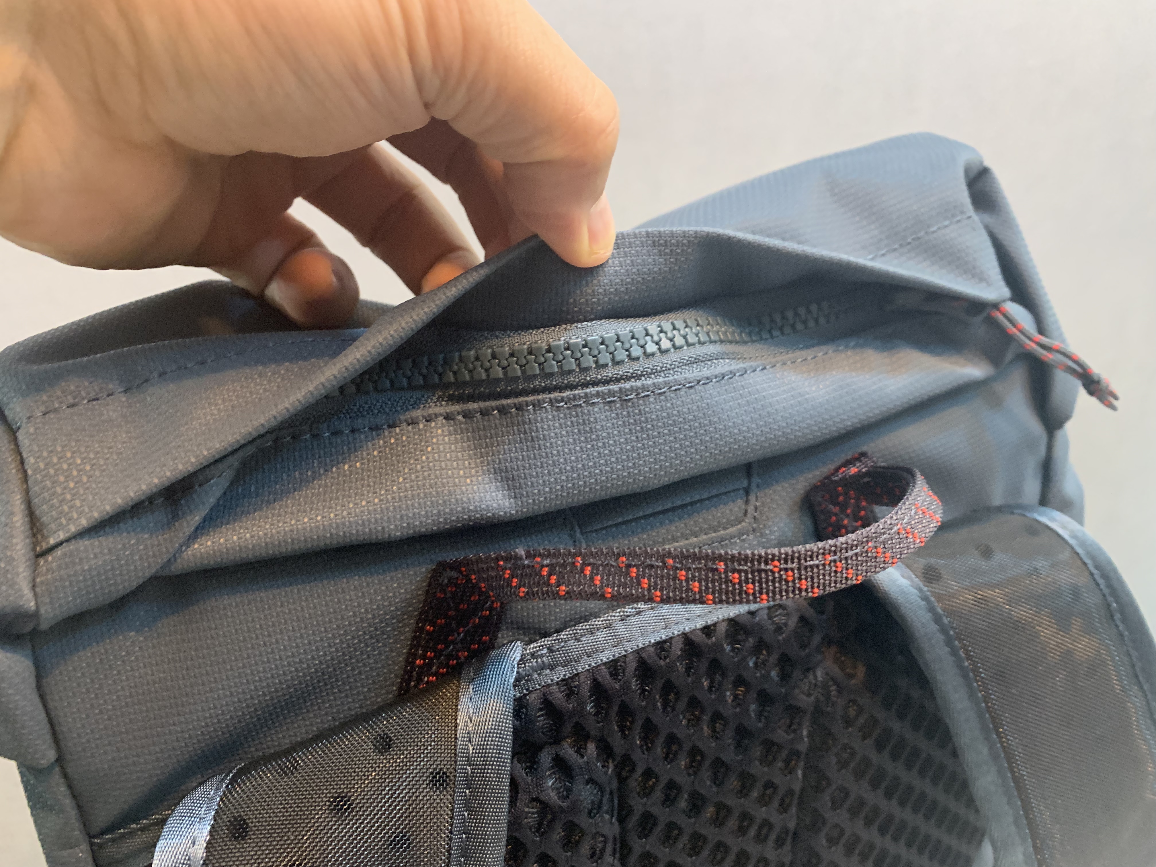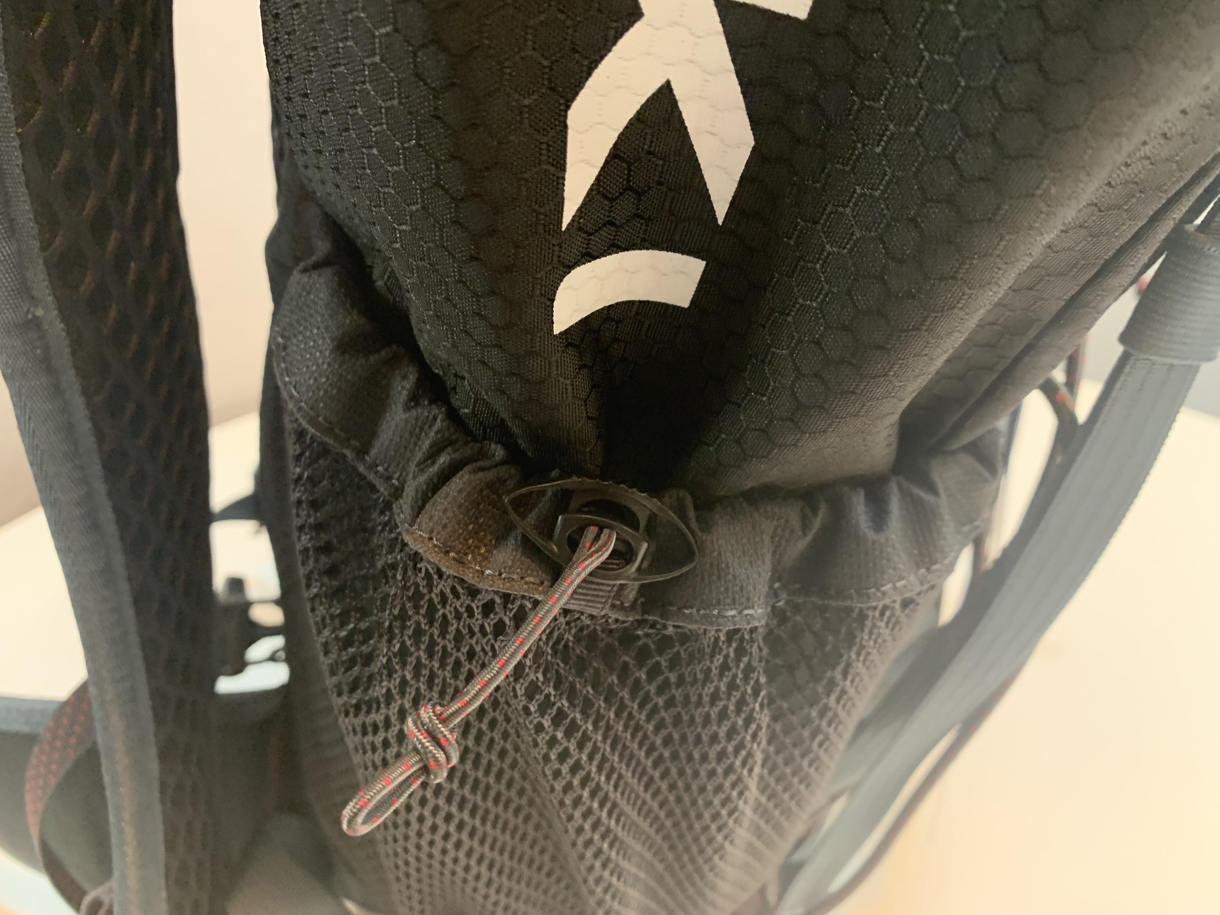 후드에 있는 포켓입니다. 보통의 후드형 배낭들과 마찬가지로 같은 위치에 수납공간이 있기는 한데 의외로 물건을 넣고 빼기가 쉽지 않습니다. 넓이는 충분한데 높이가 여유롭지 않아서 헤드랜턴이나 선글라스를 넣은 파우치는 넣기가 쉽지 않았습니다. 잘 하면 부피가 그리 크지 않은 티슈나 얇은 보조배터리 정도는 가능했습니다.