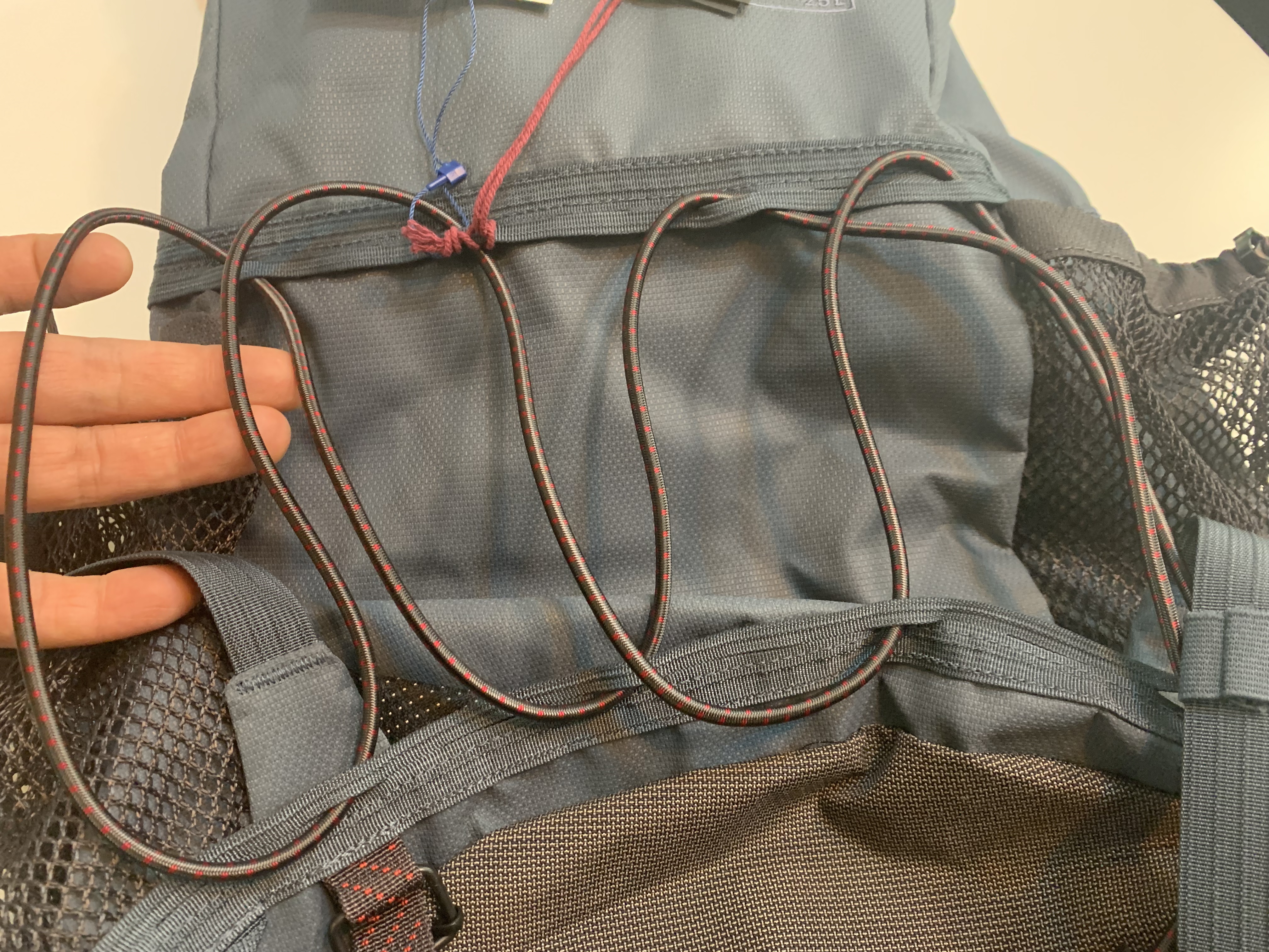 그 외에 기능적으로 다가왔던 가장 특징적인 두 가지 부분은 먼저 정면입니다. 보통 배낭의 정면에는 캥거루 포켓이 있는데 클라터뮤젠 델링은 탄성 스트링이 촘촘하게 연결되어 있어서 급하게 재킷이나 장갑 또는 방한 용품과 같은 물건들을 빠르게 벗어서 배낭에 결속하기에 좋은 편리성을 제공합니다. 또한 사이드포켓의 형태인데 보통 탄성이 있는 메쉬 형태의 소재를 사용해서 포켓에 물건을 넣으면 늘어나는 구조인데 특이하게 델링은 단순한 메쉬 소재를 사용해서 오래 사용하더라도 늘어짐 없이 꾸준하게 그 형태를 유지할 수 있다는 특징이 있는 것으로 보입니다.