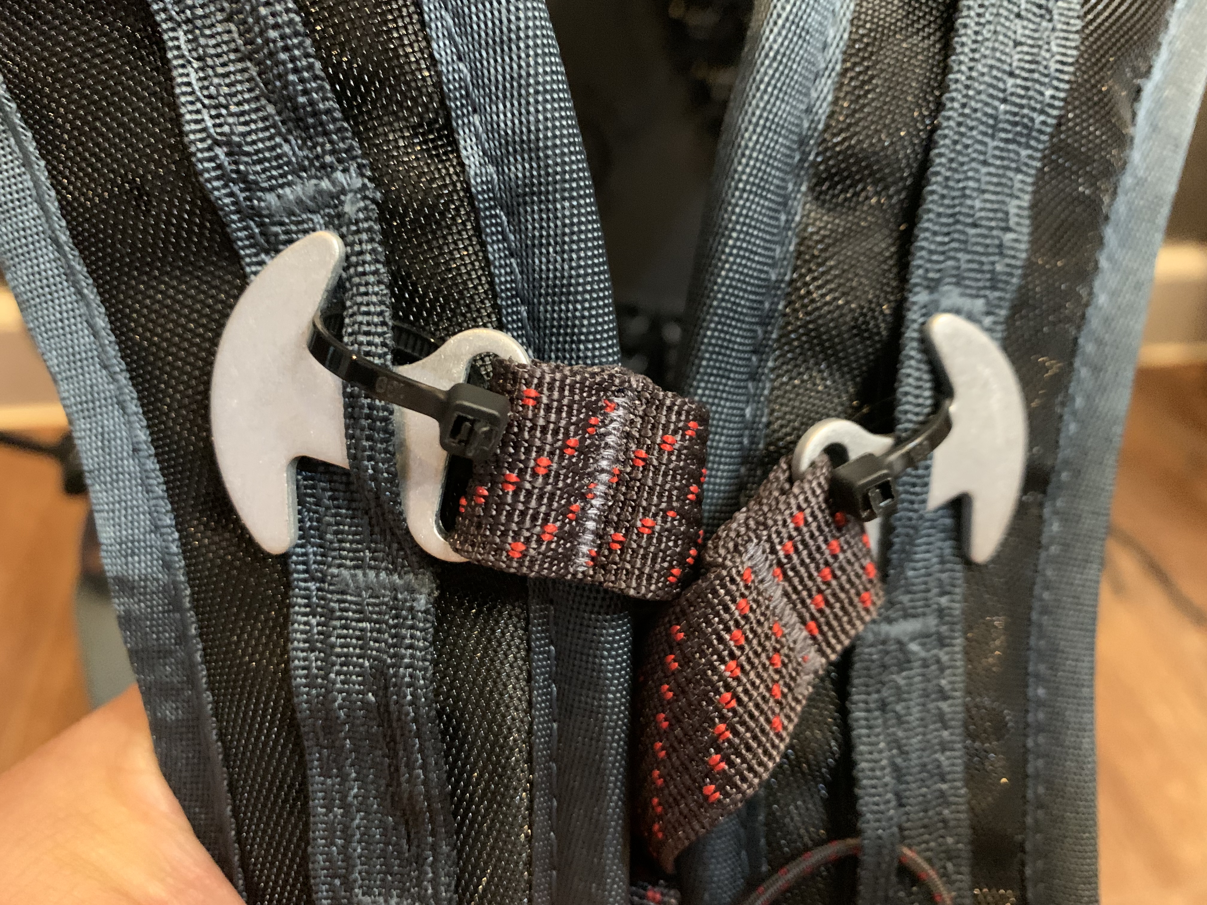 가슴벨트입니다. 후기를 많이 봤는데 논란이 가장 많은 부분이 아닐까 싶습니다. 클라터뮤젠 특유의 결속 방식인데 이게 잘 빠질까 봐 불안하다는 의견을 많이 봤는데 실제로 제품을 받아보니 정말 그럴 수 있겠다는 생각이 들었습니다.