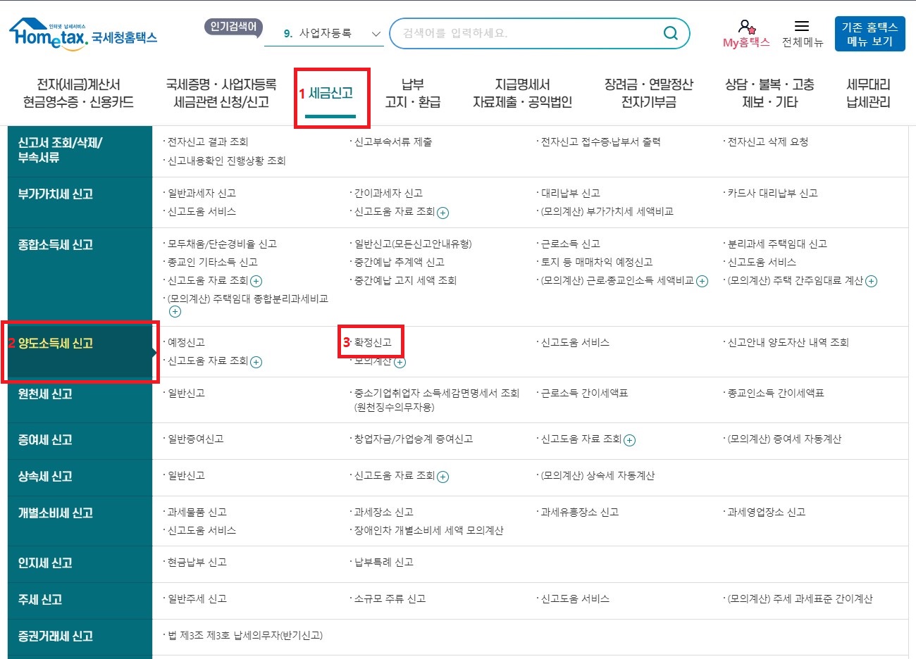 막상 계산해 보니 상당한 금액입니다. 혹시나 장기투자를 하여 거둔 수익이 5천만 원이라고 한다면 양도소득세는 천만 원이 넘는 세금을 납부해야 합니다. 그렇다면 이러한 세금을 신고하고 납부하는 방법은 어떻게 될까요? 국세청의 홈택스 웹사이트에서 하게 됩니다.