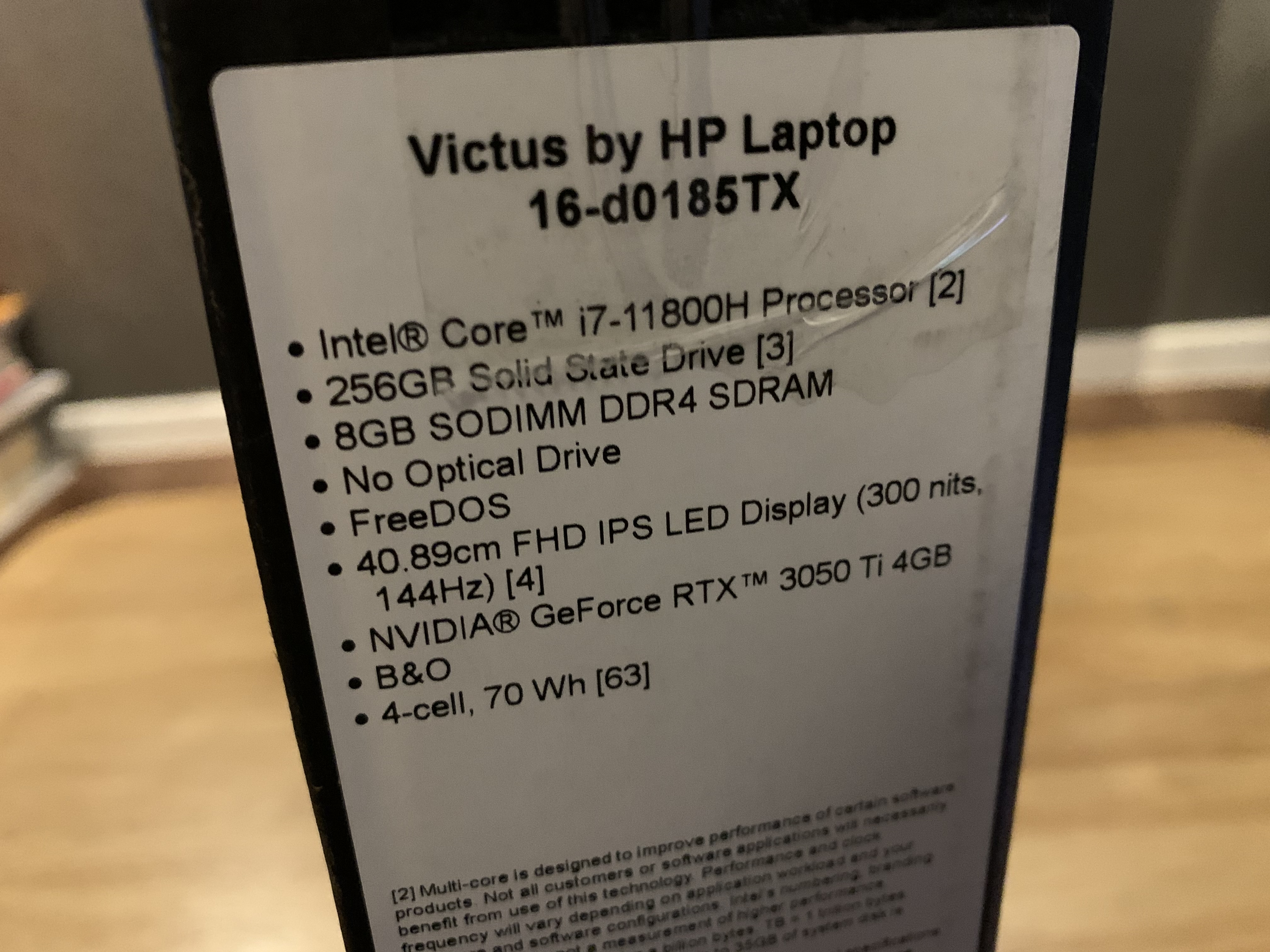 제품 박스의 옆 면에는 박스 안에 있는 HP 빅터스의 사양이 간략하게 적혀있었어요. 저는 여기서 SSD를 512GB로, 메모리를 16GB로 업그레이드했습니다. 또 FreeDos 제품이나 윈도우11로 설치하여 받았습니다.